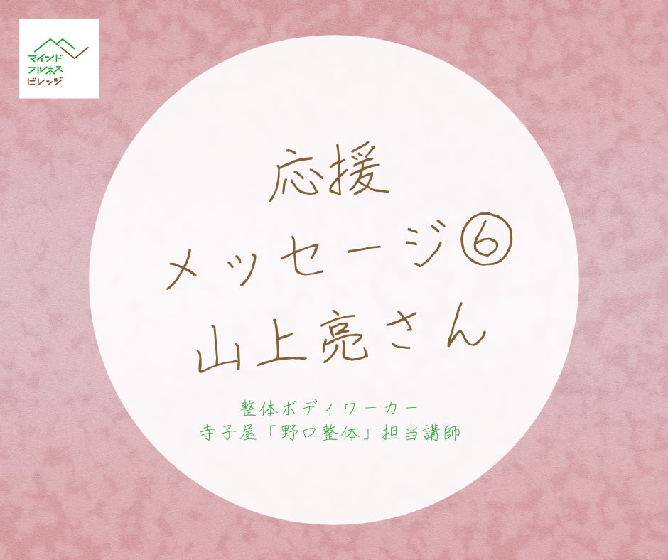 今日は整体ボディワーカーの山上亮さんから応援メッセージをいただきました。私は1998年に『セラピスト』誌主催の野口整体の集中講座でお目にかかって以来、子育て講座から整体の個人指導まで様々な場でご指導いただいてきました。