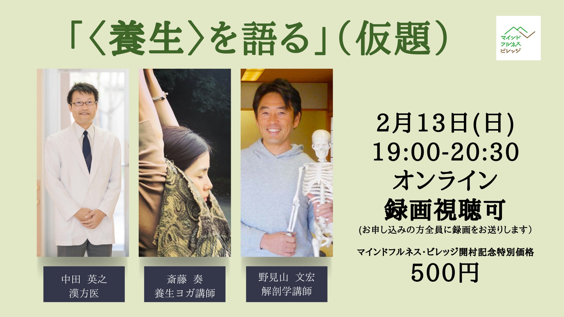 先日の「養生ヨガ」の中田英之さん(漢方医)、斎藤奏さん(養生ヨガ)に野見山文宏さんが加わった鼎談「〈養生〉を語る」が2月13日夜に開催されます。こちらもどうぞよろしくお願いいたします!(お申込み ⇒ http://ptix.at/zK0cKO )