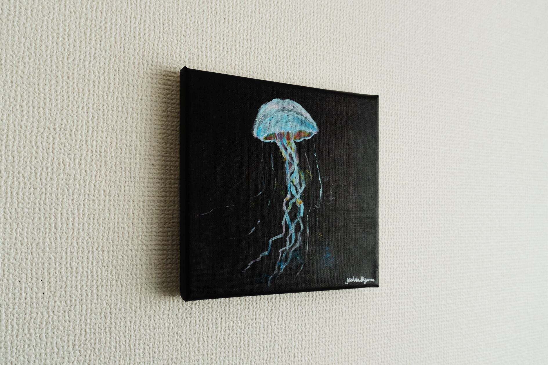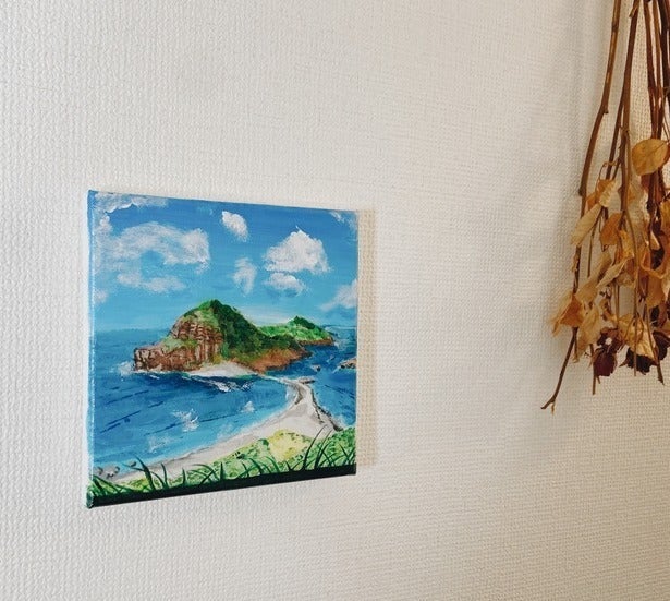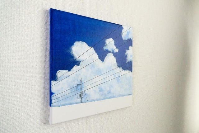 正方形のキャンバスに描いてお届けしますので、賃貸のおうちでも壁に画鋲を使って簡単に飾ることができます。