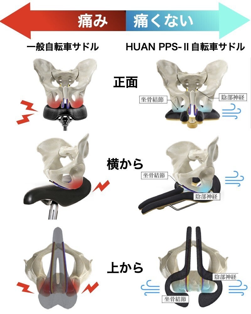 HUAN PPS-IIは、人間工学に基づくデザインを徹底研究し、骨盤を包み込む様なサドル形状で坐骨結節と陰部神経への圧迫を軽減しているのです。