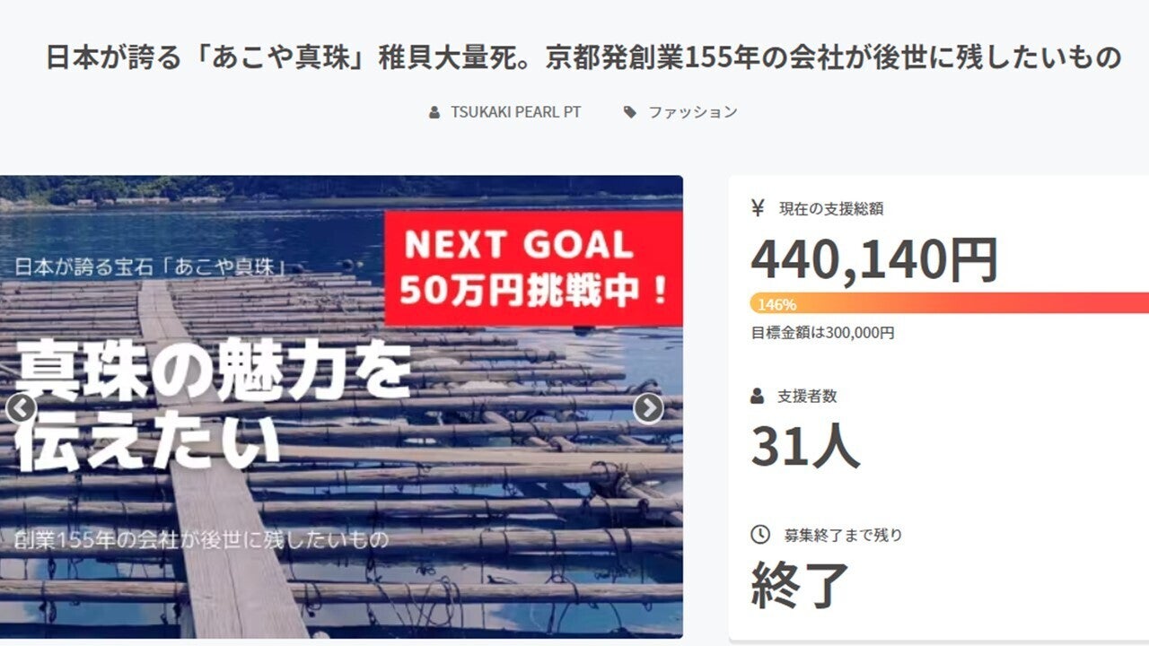 前回、昨今の真珠を取り巻く環境を改善したいとの思いから、初めてのクラウドファンディングを挑戦させて頂き、たくさんの方々にご支援、応援コメントをいただき、目標達成することができました。