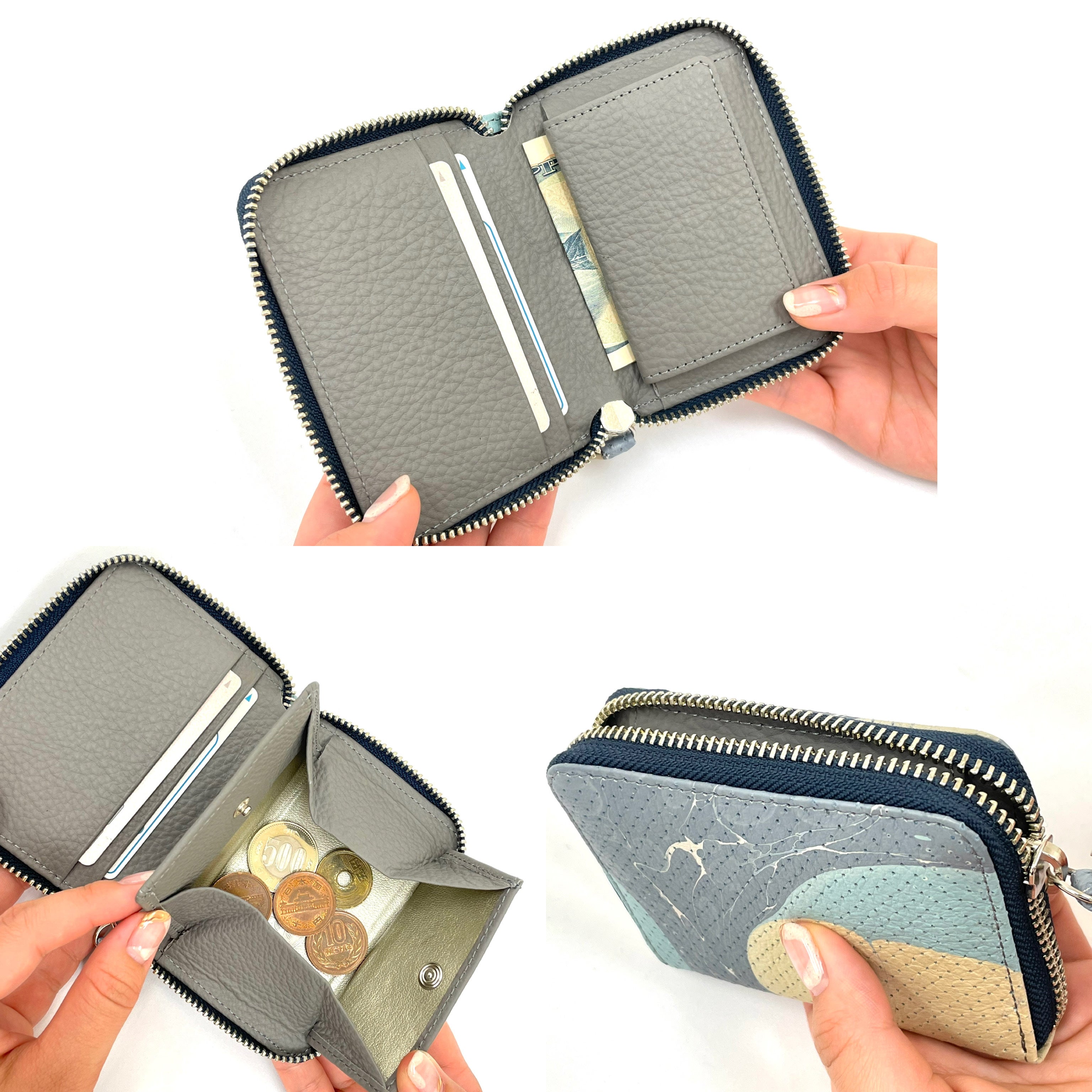 〇小銭ポケット 〇カード入れ(2枚) 〇お札(3つ折り)