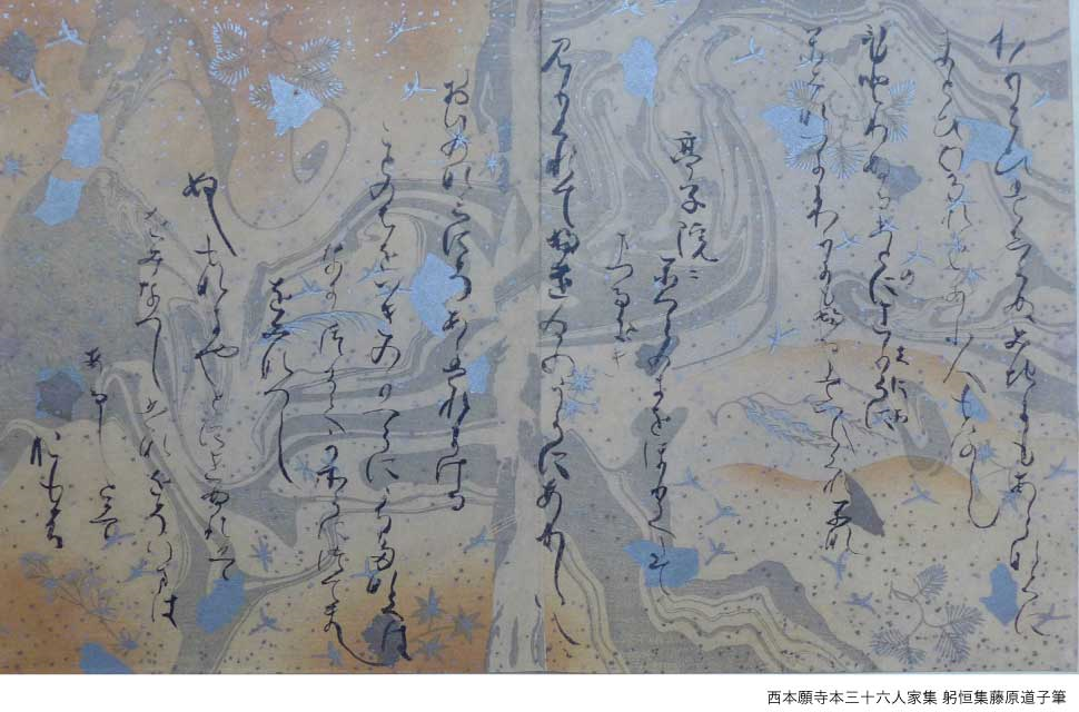 墨流しという技法は、平安時代後期の王朝貴族が川に墨を流し模様の変化を楽しむ遊びを起点としています。そののち、宮廷の女人たちが、宮中でも楽しむために、水盤の水面に墨を浮かべ、その模様を紙に写しとり、短冊や色紙に詩歌を書くようになりました。この遊びがやがて、紙の製法の発展にともない、装飾技法のひとつとしての墨流しとして一般化し、和歌や仮名料紙などの意匠に応用されるようになったと言われています。