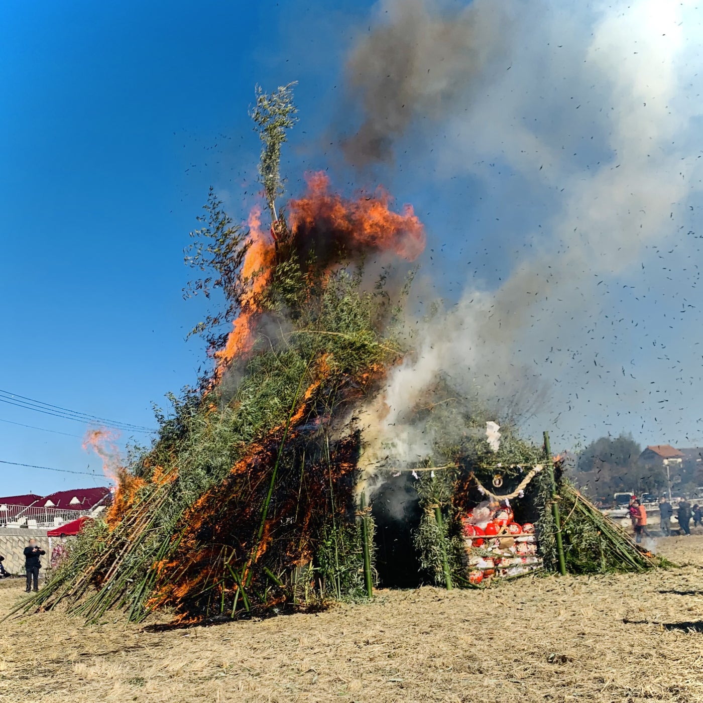殺陣パフォーマンスの後、いざ「どんど焼き」のやぐらに火が付くと、その勢いは猛烈なもの。戦国の頃、「上泉でのろしが上がれば、箕輪城まで見えた」という伝説の如し。煙は渦を描いて舞い上がり、炎は近寄れないほどの熱さ、竹の激しく爆ぜる音。
