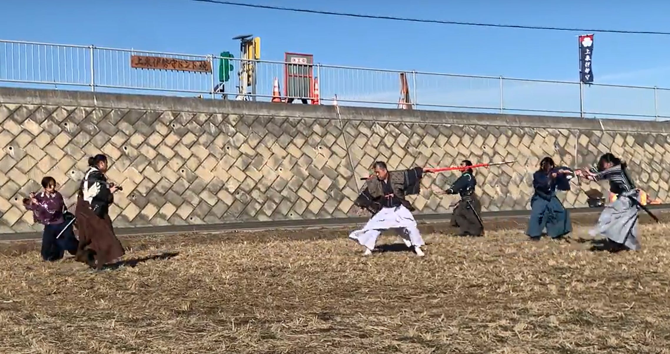 田んぼの中で殺陣をするなんて、滅多にない貴重な機会。特に主宰・太田は、上泉伊勢守をイメージした、朱槍の殺陣を披露しました。