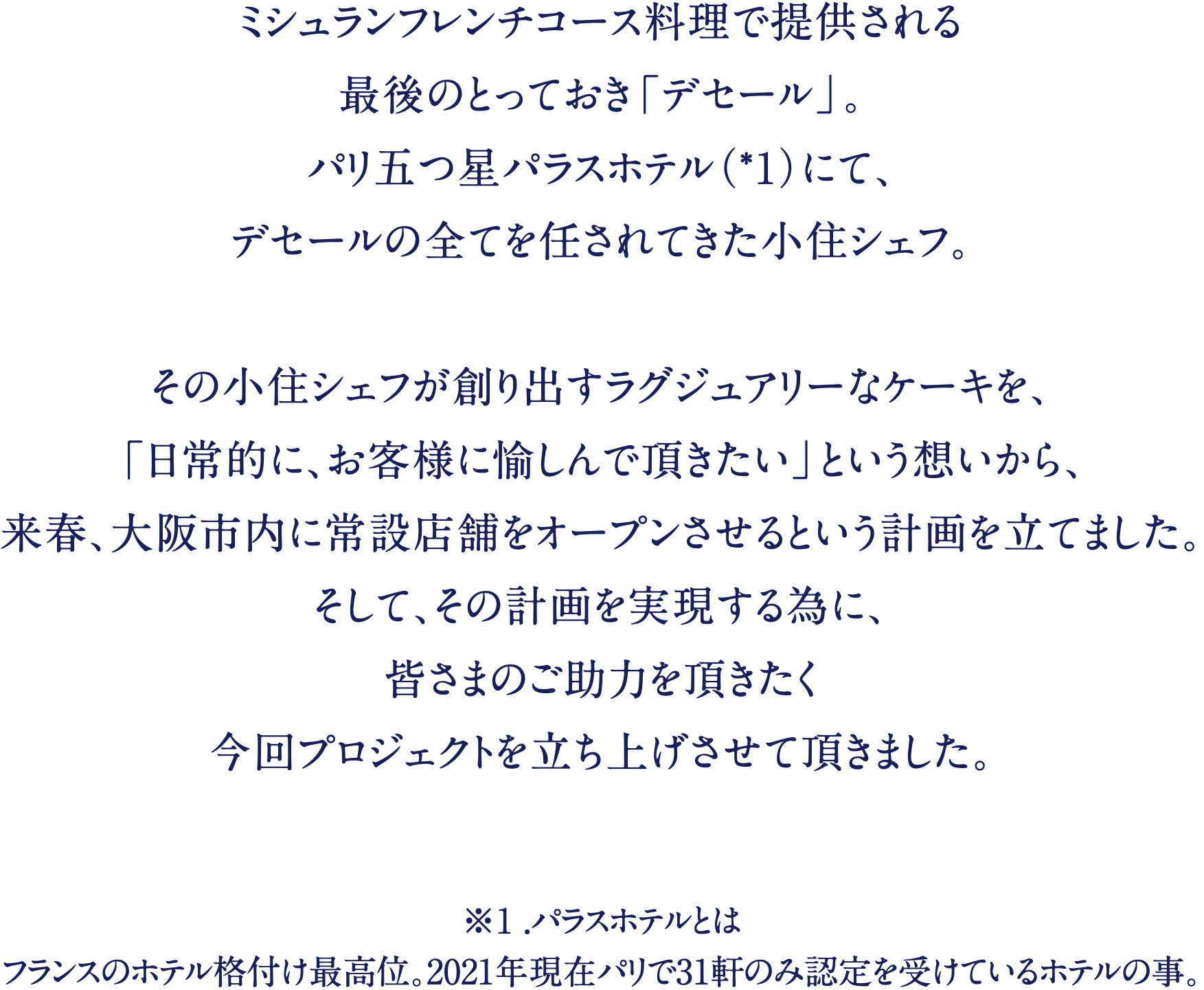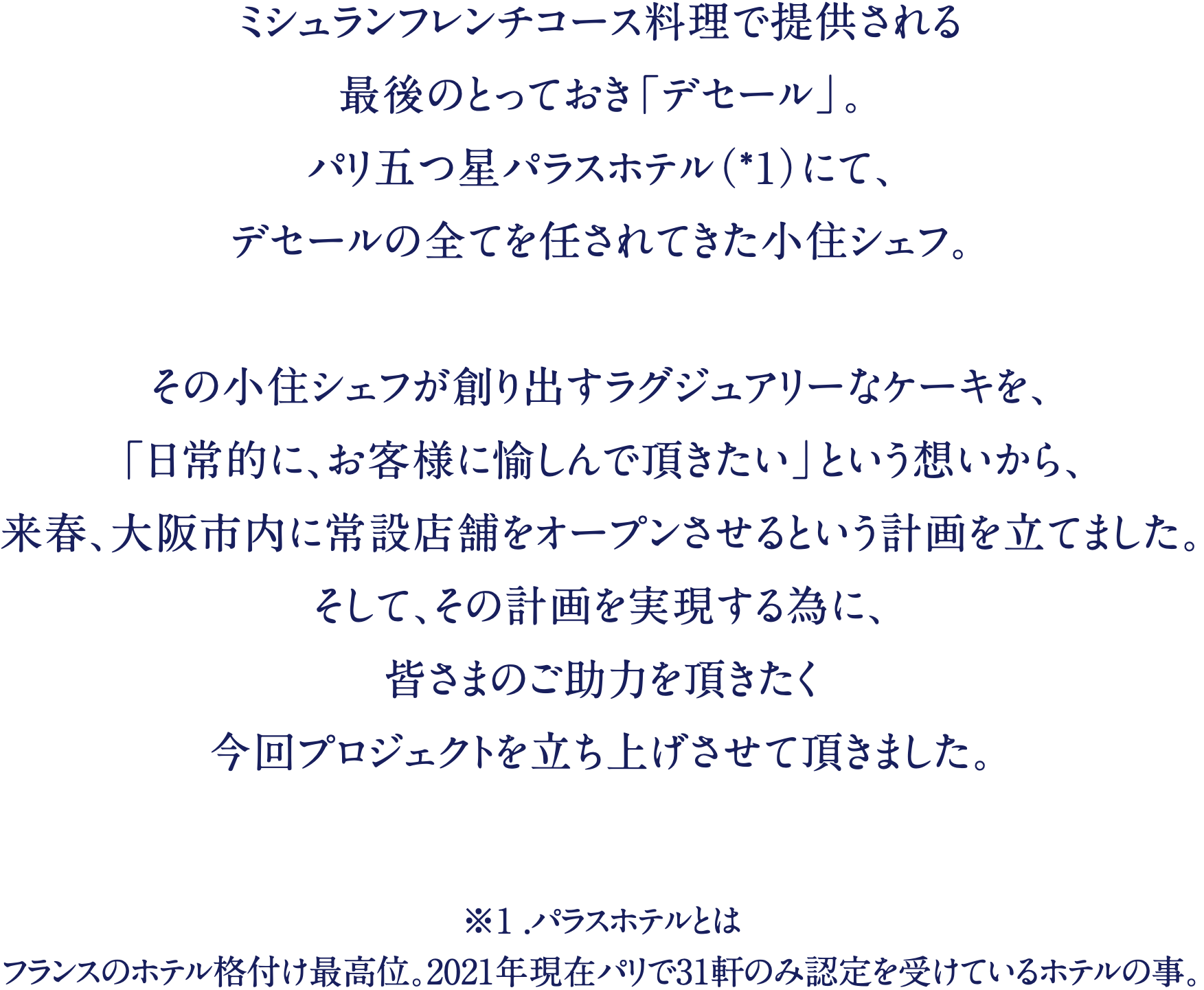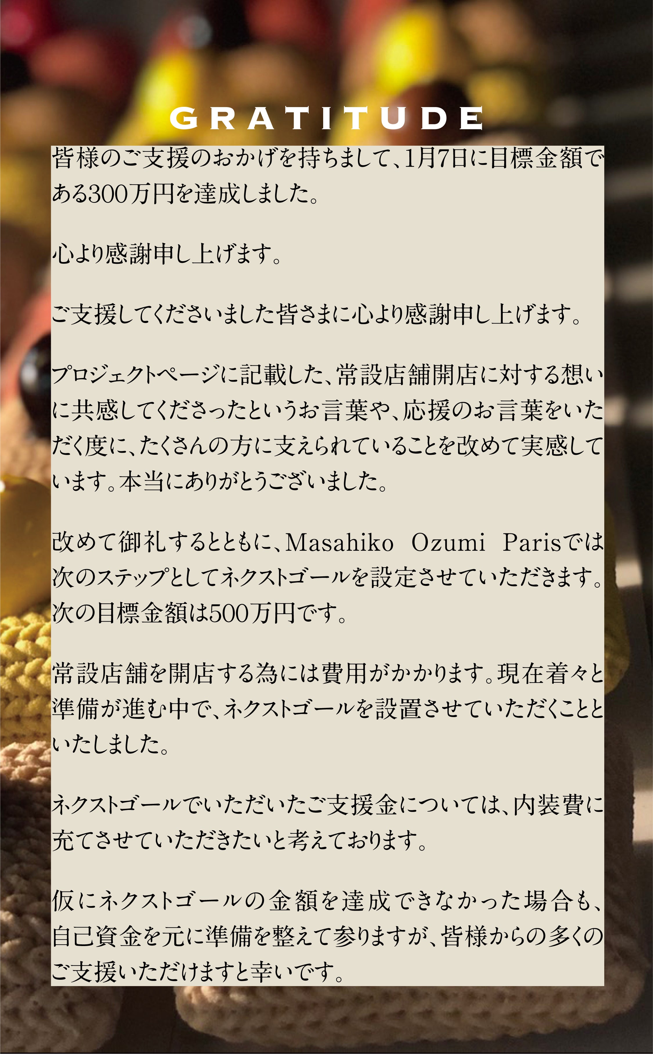 シェフとして折角何時間も並んで頂いているのに、ご希望のケーキが提供出来ない現実や、Masahiko Ozumi Parisのケーキを、日常でも気軽に食べて頂きたいという想いから、常設店をオープンしたいと考えるようになりました。そして、これらの想いを実現する為に、皆さまのご助力を頂きたく今回プロジェクトを立ち上げさせて頂きました。
