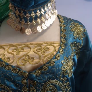 触れると少しひんやりするゴールドの生地。腰にはスパンコールとフリンジで縁取ったショール。女性らしいラインをグッと引き出してくれます。上に羽織っているのはワインレッドのベルベット生地にゴールドとレッドの刺繍です。