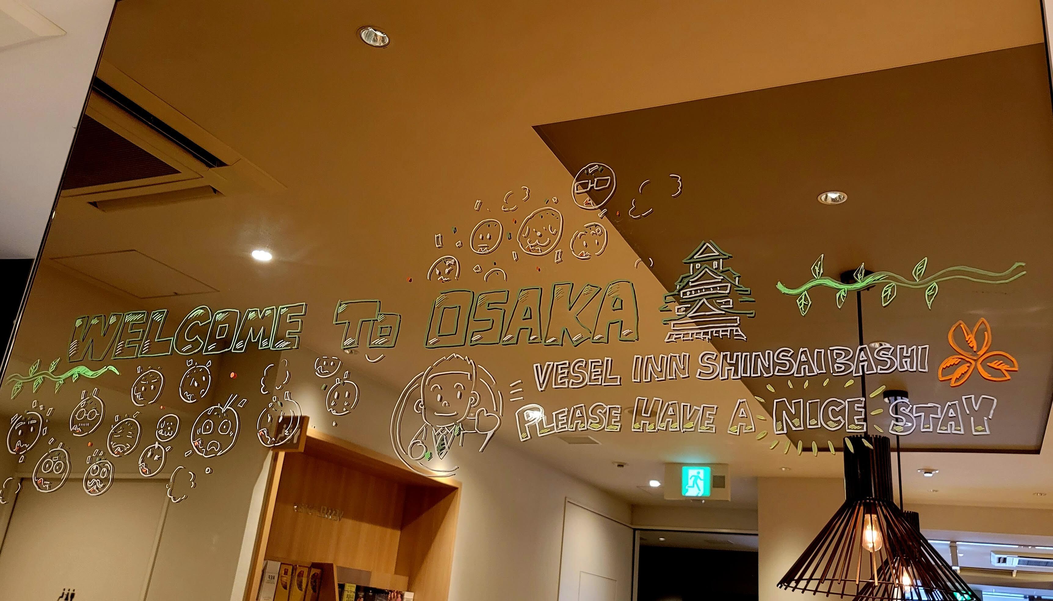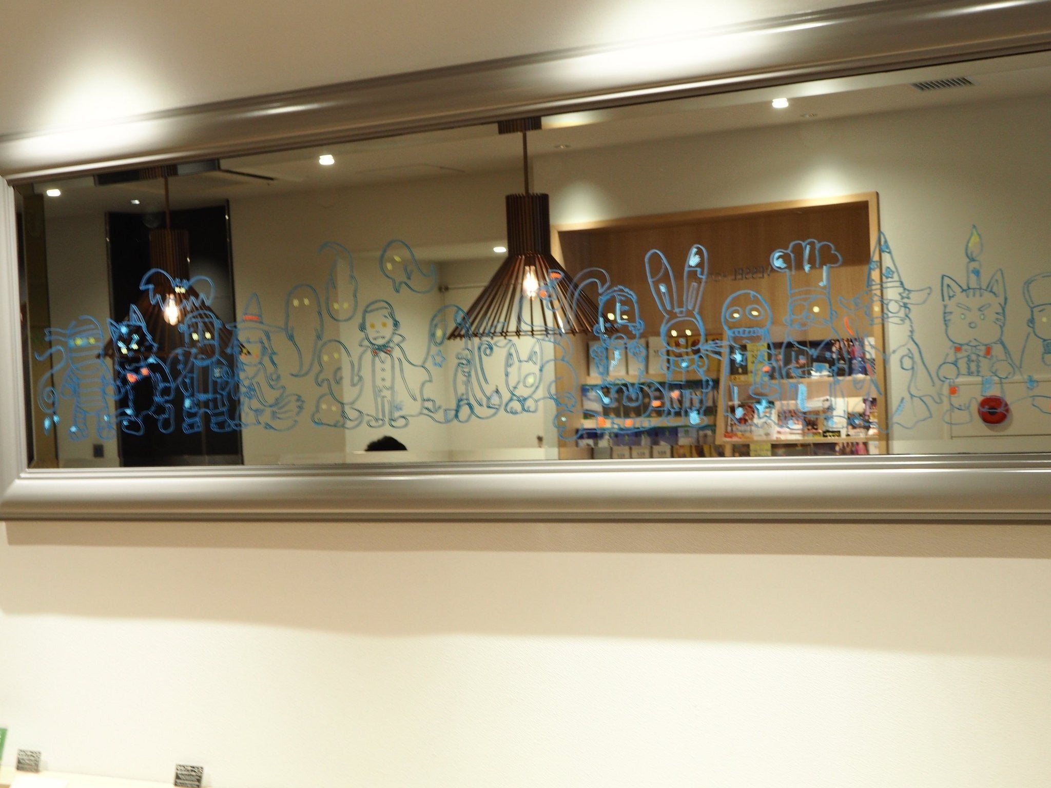 ベッセルイン心斎橋で、今回は鏡にハロウィンのイラストと、ホテルの内装にあわせて、描きました。