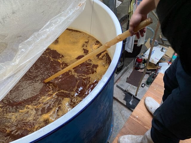 本日は、焼酎の仕込みタンクを混ぜています。そしてしっかりと発酵しているか確認してから上手く発酵していたらそのまま蒸留していきます。