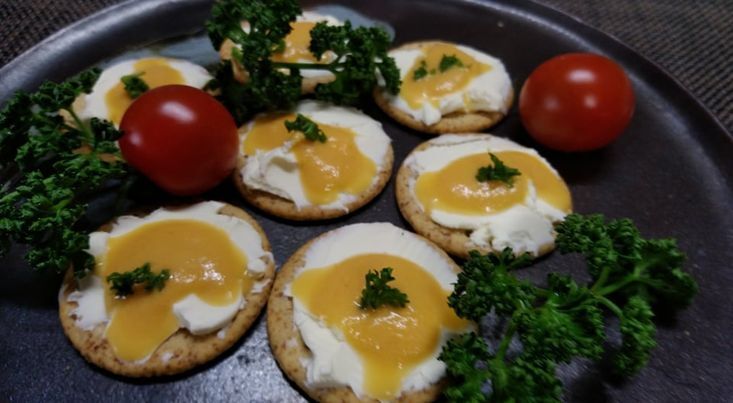 【カナッペ】 クラッカーにクリームチーズとビスク。 新鮮野菜のソースとして。ディップでも。