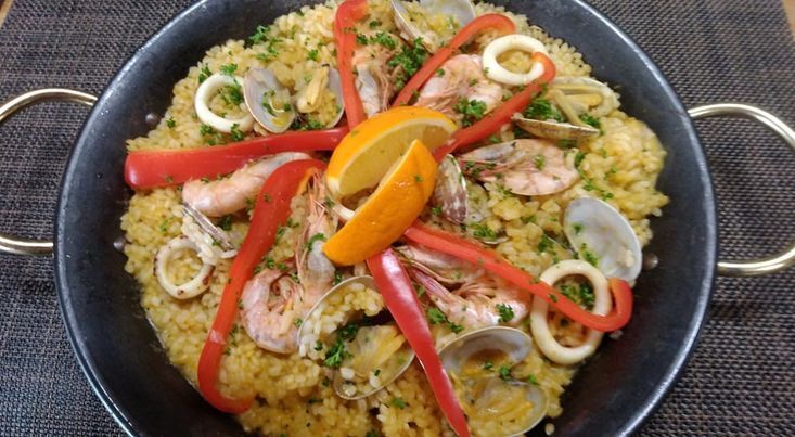 【パエリア】 サフランの代わりにビスクスープで炊き上げました。