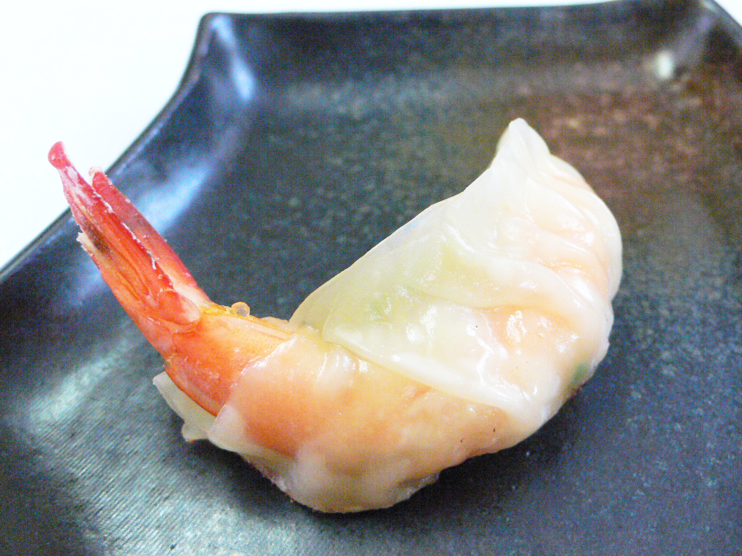 皮:小麦粉、酒精、コーンスターチ、食塩、粉末油脂、トレハロース、ソルビット、pH調整剤、加工澱粉、レシチン、カゼインNa(乳由来)(原材料の一部にえび・豚肉・小麦・山芋・ごま・大豆・卵・乳成分を含む)