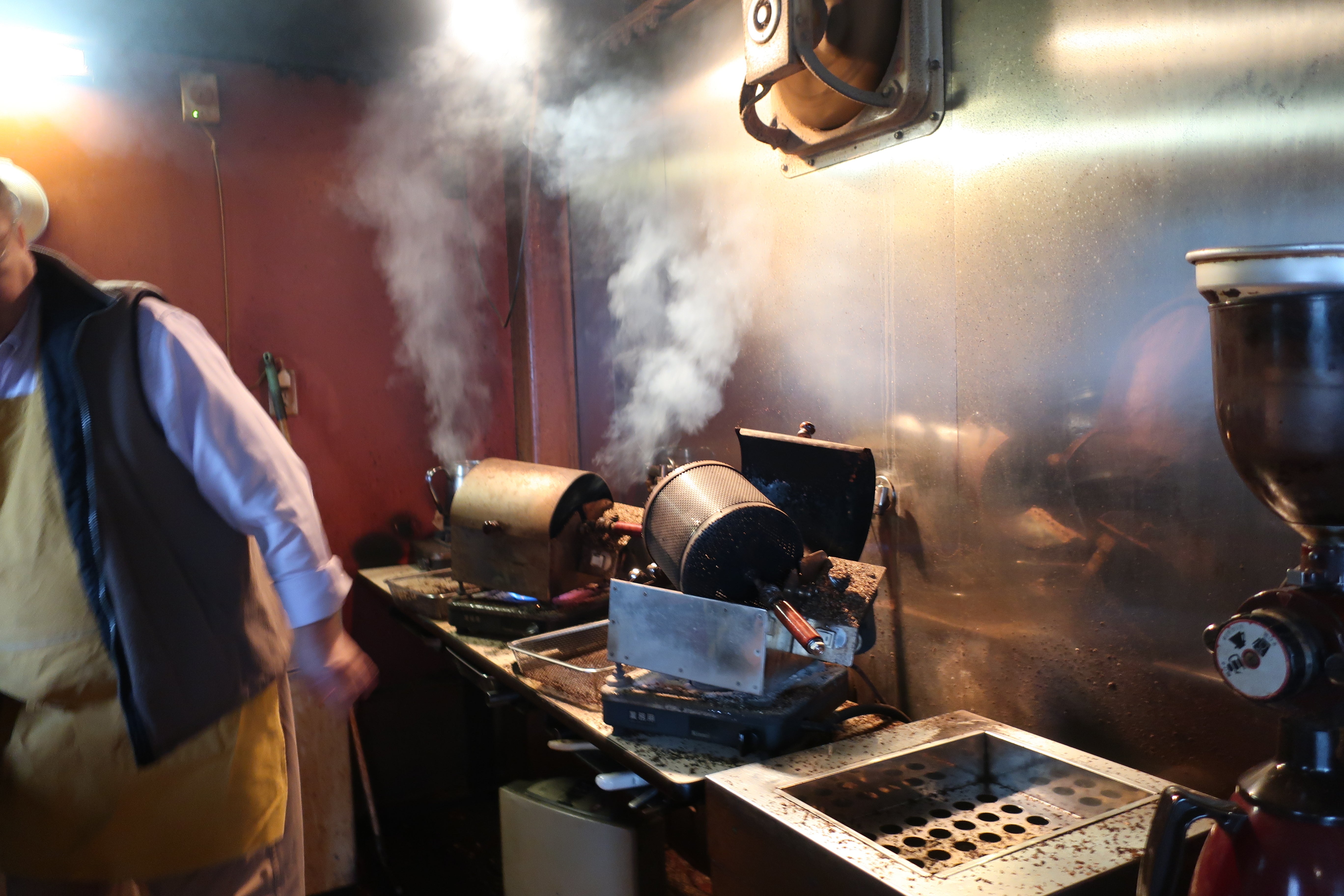 焙煎機の中で珈琲豆が転がる音、熱くなった豆が跳ねる音。湯気が立ち上る。いい香りに包まれる。店から外へ出ると、何かとばりをくぐって違う世界から現実に戻ったような、不思議な気持ち。心がほかほかする。家へ帰ったら焙煎したての珈琲が飲める。なんて素敵なお店だろう!