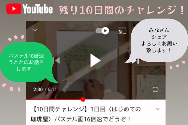 今日から【10日間チャレンジ】を始めました。最終日まで毎朝、パステルを描きます。16倍速で動画にして、アフレコで〈珈琲うとと〉のお話をします。たくさんの人に届いてほしい一心です。是非シェア等よろしくお願い致します!