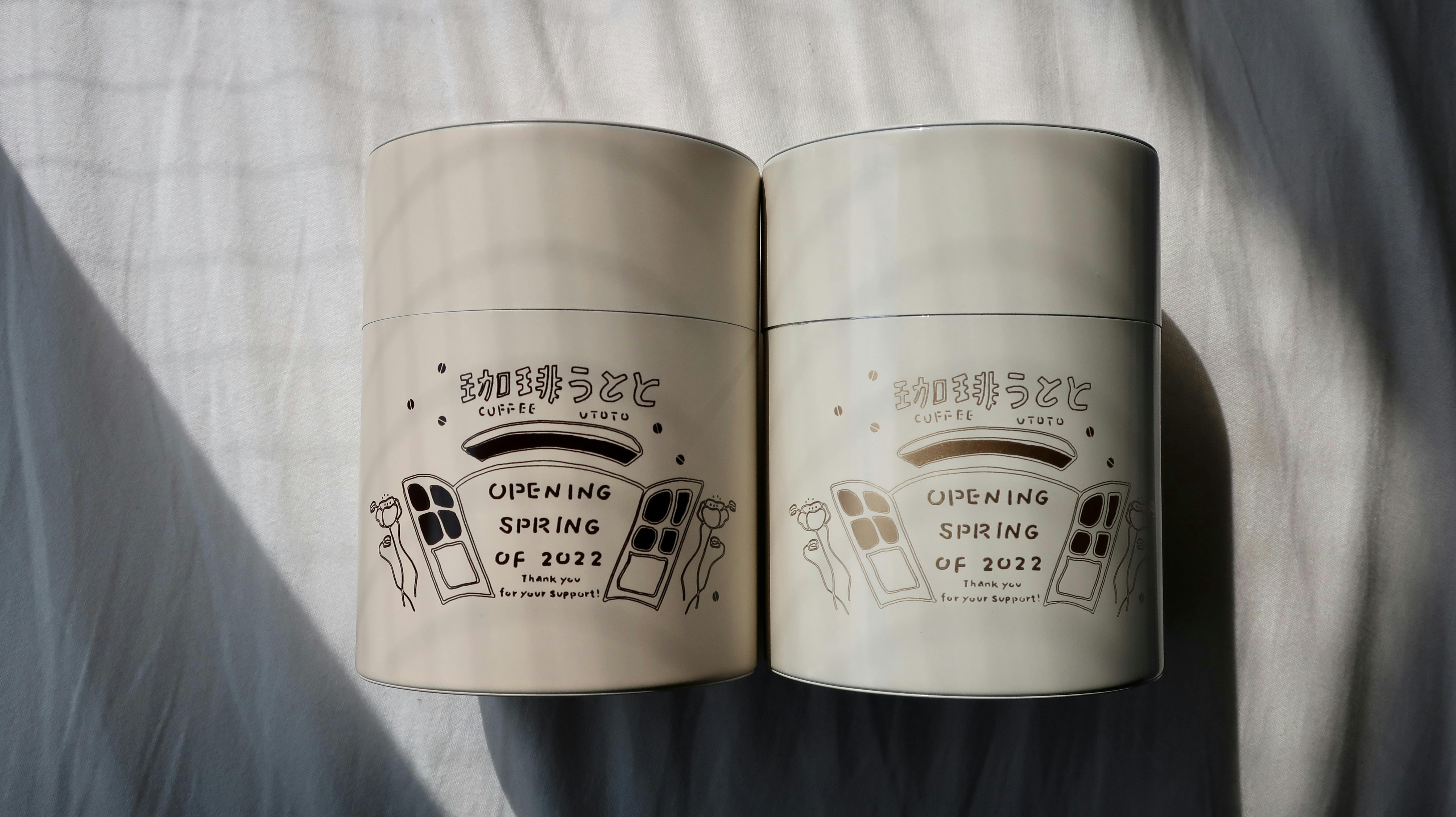 CAMP FIREクラウドファンディングにて【オープン記念珈琲缶】のリターンをお選びいただいた方には、こちら二色の缶を両方お届け致します。珈琲だけでなく、おつまみやお菓子、海苔、使い方を考えるも楽しいですよ!お届けするのが楽しみ!