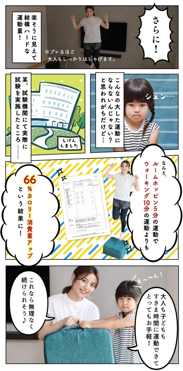大人はもちろん、お子さまが使っても大丈夫!その場でぴょんぴょん跳ぶだけで運動になるので、雨の日や時間がなく外に遊びに行けない日でも手軽に運動していただけます。