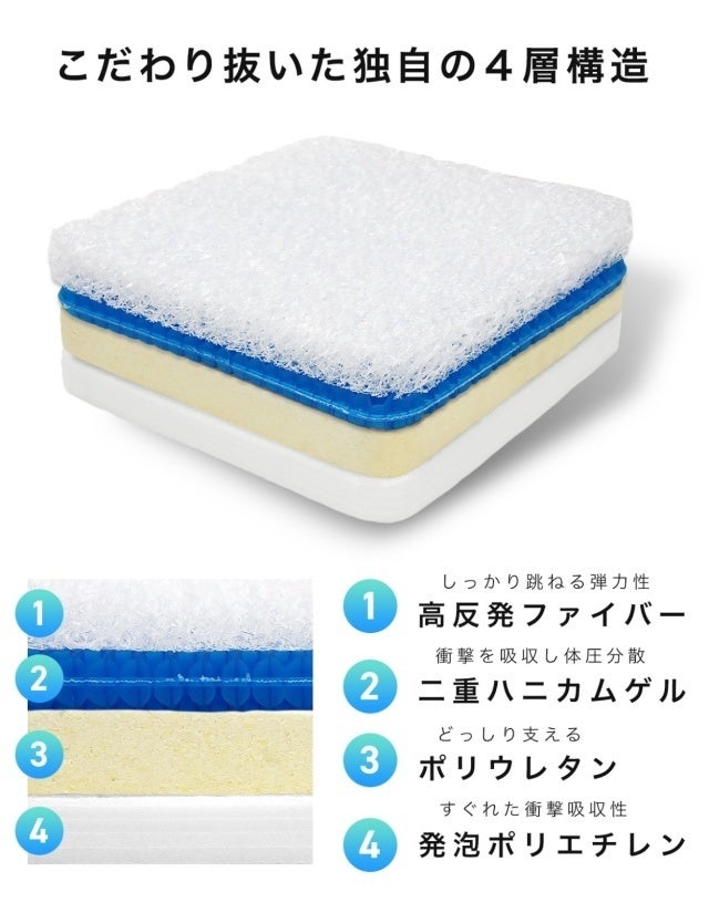 A. お届け時の順番は①高反発ファイバー ②二重ハニカムゲル ③ポリウレタン ④発泡ポリエチレン の順番で、一番跳ね返りが実感できる順番となっておりますが、お好みに合わせて順番を入れ替えていただくことも可能です。