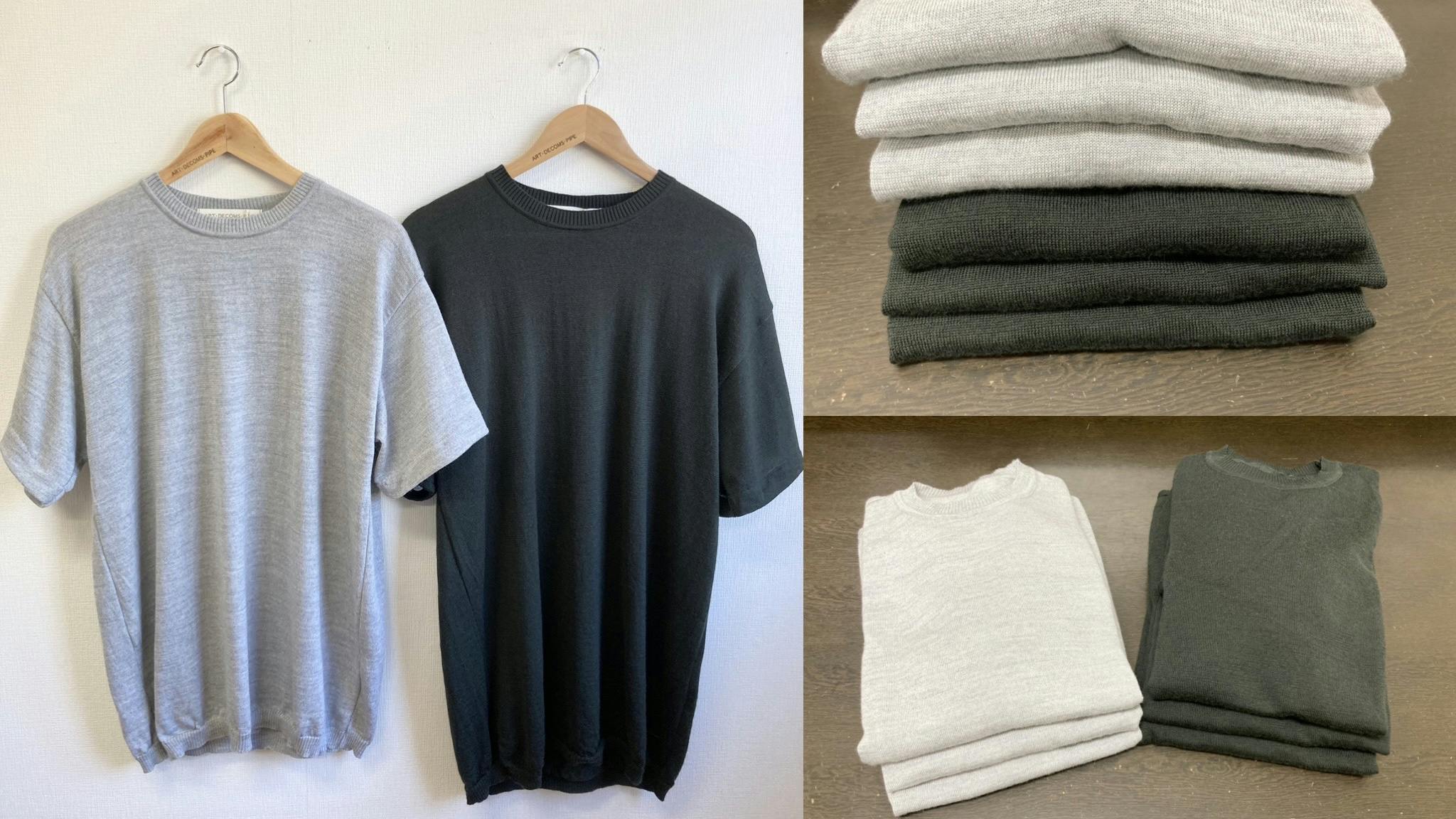 日本製で作られたシンプルな半袖のニット製品です。新品の倉庫に大量ストックしていたものをリメイクして新しいデザインに仕上げます。