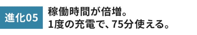 充電時間もスピードもアップし、1時間でフル充電。その後およそ75分間使用できるようになりました。