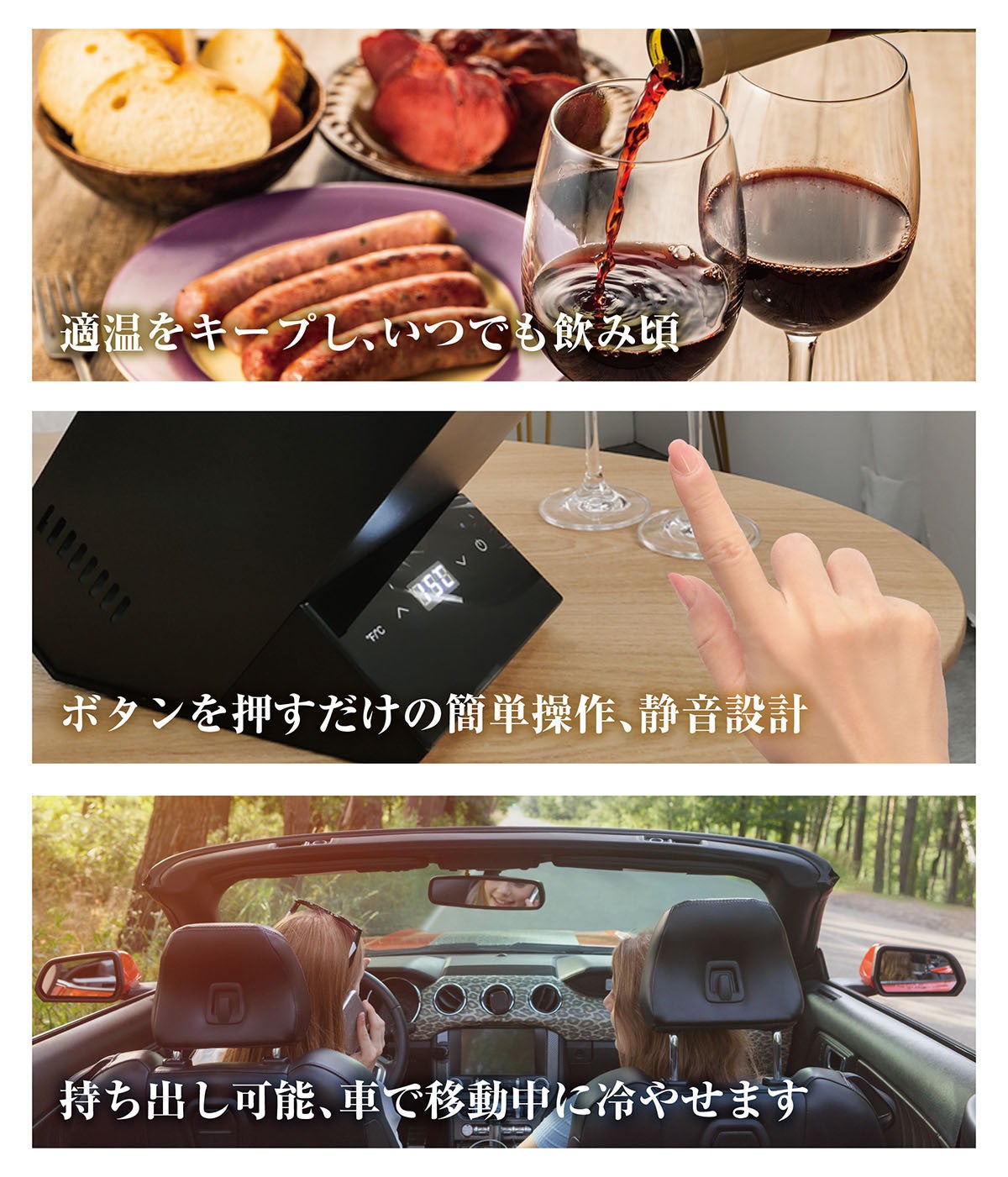 また、別売で車用シガーソケットからの電源供給を可能にする「車用シガーソケットケーブル」を準備しています。キャンプ地へ車で移動しながらワインを冷やす、または シガーソケット出力を持ったポータブル電源を使えば、屋外で使う事ができます。従来の大型ワインセラーではできない使い方です。