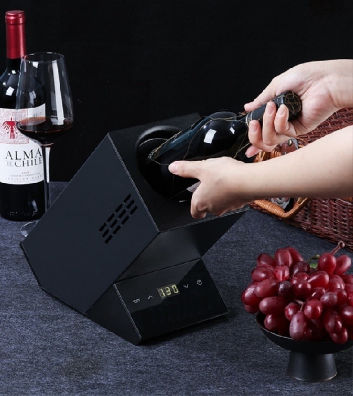 しかし飲み始めた後、ワインボトルの温度は刻々と変化していきます。氷で冷やす方法では温度管理ができませんし、特に赤ワインは、かえって冷えすぎて味を損ねてしまうという事も起こります。また、ワインセラーは持ち運ぶ事が困難、屋外は元より、就寝前にベッドルームで適温ワインを少々....という手軽さはありません。