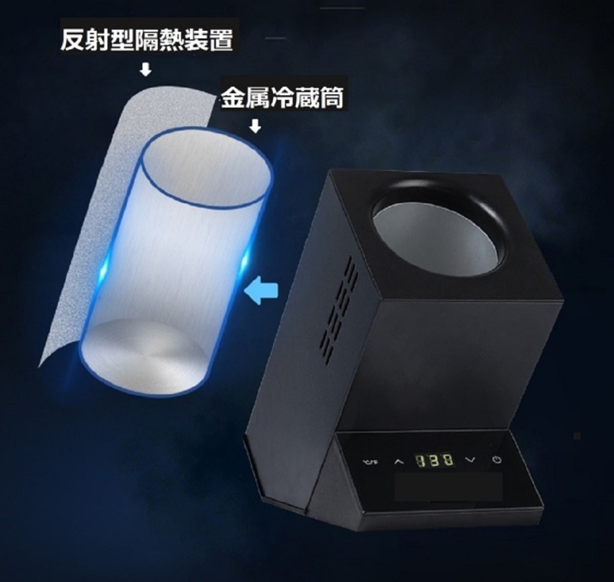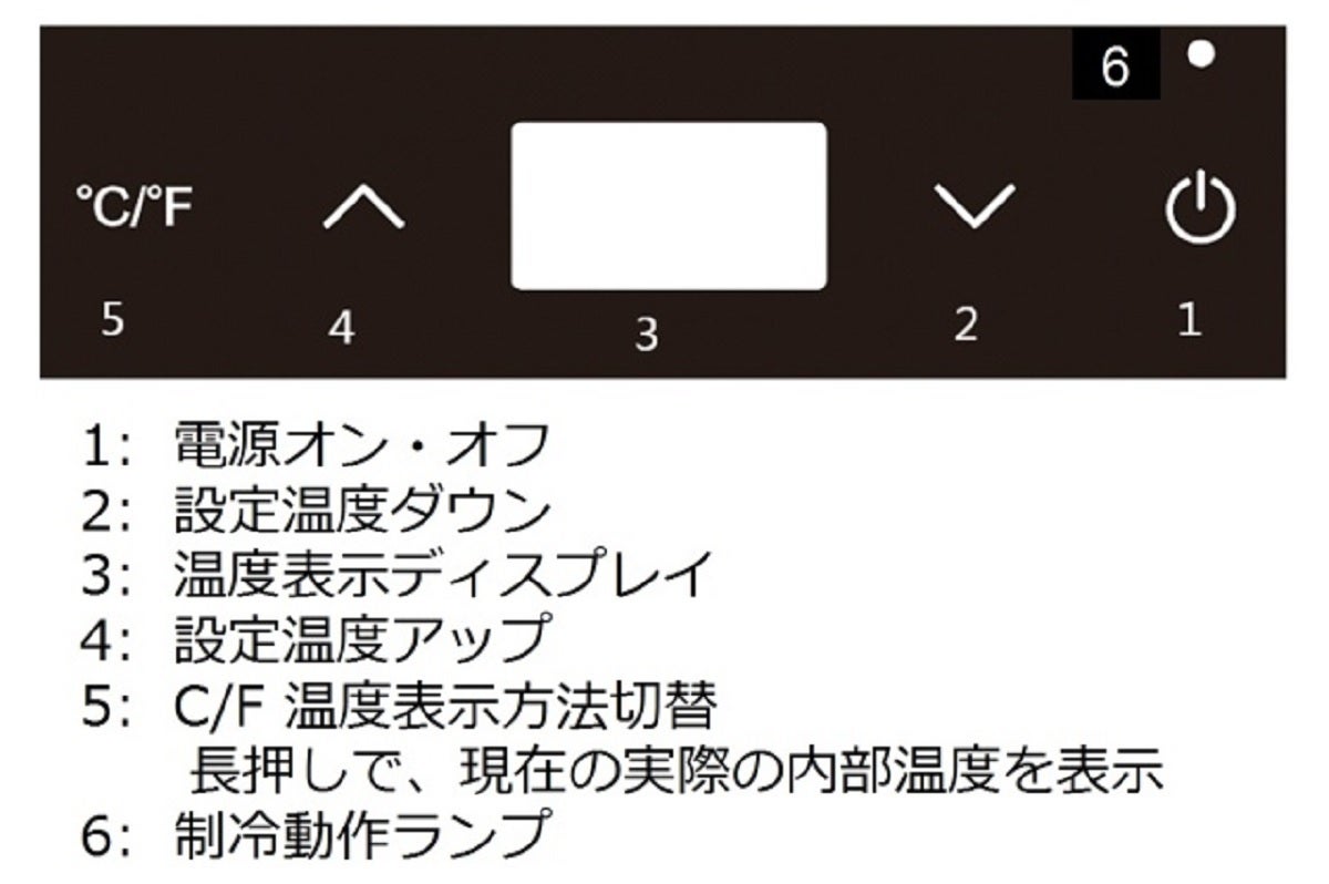 「ペルチェ方式」は外気温が上がると冷却能力が低下すると言われていますが、室温32℃環境下で設定温度5℃にした場合、10分以内に金属冷蔵筒の実際温度が5℃に達する事が確認できています。以下が操作パネル部です。