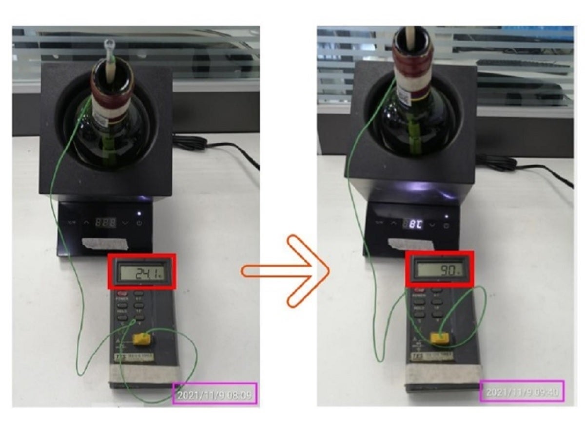 以下の写真、設定温度8℃、左が冷却前、右が冷却後です。時刻8:09→9:40、1時間半経過した後の温度です。ボトル内部水温 24.1℃が9℃になっています。
