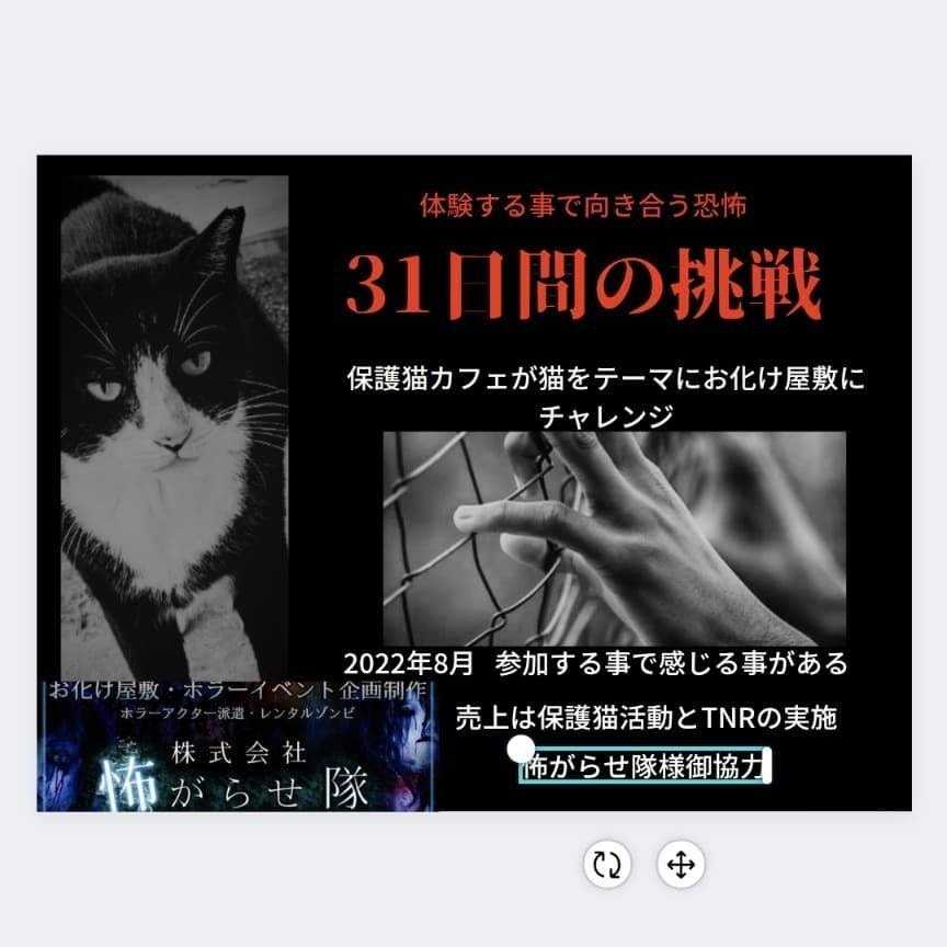 啓発活動とは人を啓発するための活動。 何事かを人に気づかせることに主眼を置いて行われる一連の活動と書いてある。じゃ 啓発とは無知の人を教え導き、その目をひらいて、物事を明らかにさせることらしいです。いやー難しい言葉。この言葉を今回書いた理由はこの保護猫カフェをやっていて少しばかり保護活動をさせて頂いている中で、関係者より時折聞く言葉なのですが…私は猫歴も浅く活動も少ない為、なんだ?その言葉?でした。で、調べて見てもよく分からん。導くなんぞ恐れ多いと、ただお店に来店された方や知り合いなんかにボソボソとお伝えしておりました。でも、これはまてよ?多くの人は、そうではないのか?動物虐待防止や捨て猫禁止のポスターをたまにみるけど、今は関心があるけど、数年前は、見てもそうだよね わかってるよ ぐらい何となく届く感じ だって当たり前と感じてた事。皆さんの多くはそうだと思います。でも、実際捨て猫と遭遇したら実際に虐待を受けた子を直接みたらネグレクト、無責任を直接みたらそのポスターの意味をまた違う感じ方が出来るのではと思っています。実際、保護猫カフェに来る子達の大半は人間が関わったのに新しい家族を探している子達保護主さんがいる子がいたらいいけど捨て台詞のように、病気の子を目の前で捨てますねや全部引き取ってくれたらよかったのになど言えなくなると思うんです。難しい言葉でも、何事かを気づかせる活動このお化け屋敷が、関わる事で体感する事で気づかせる活動ではと願い思います。皆様のあたたかいお声かけ感謝いたします。また、是非1人では届きにくい言葉でも皆様の力で啓発活動をしませんか?どうかよろしくお願い致します。