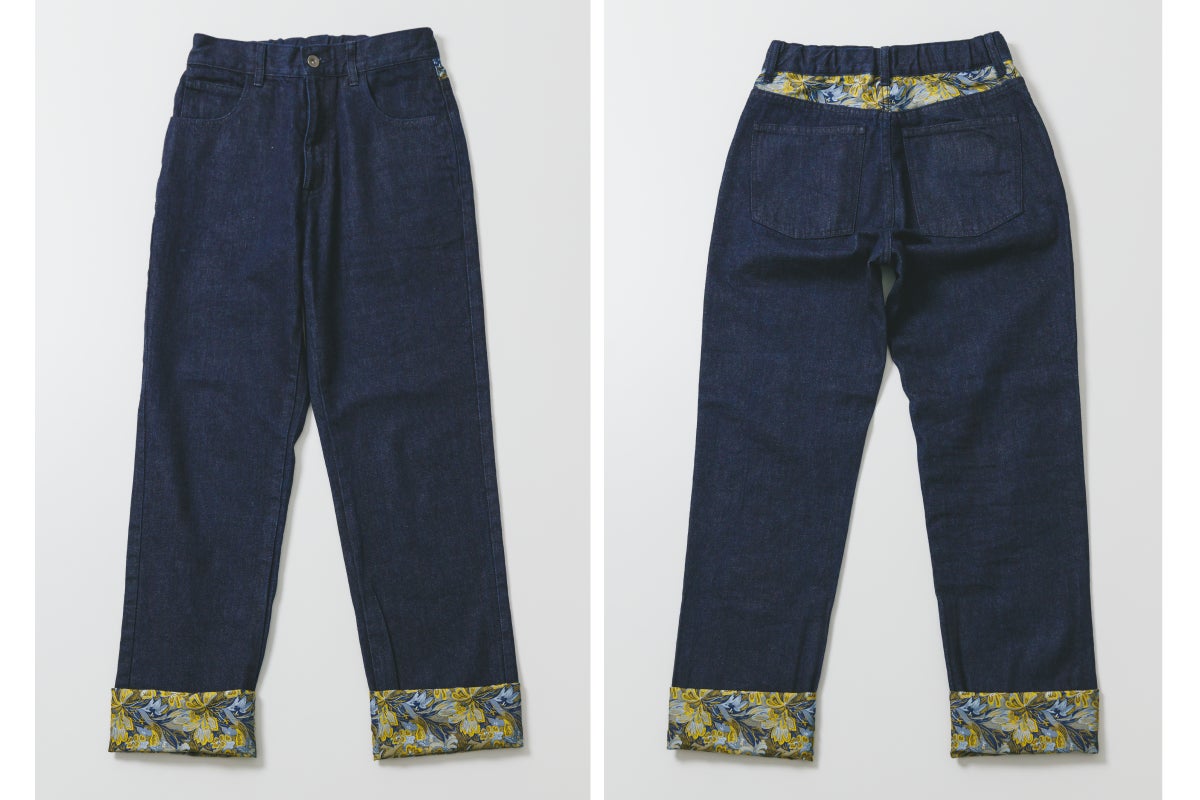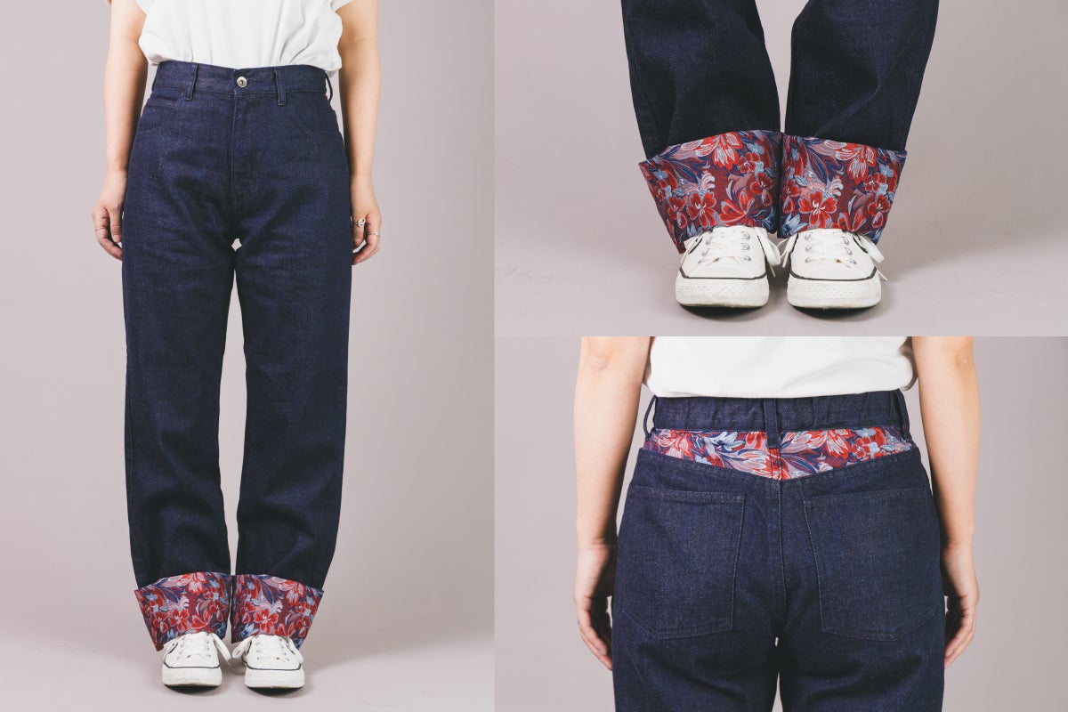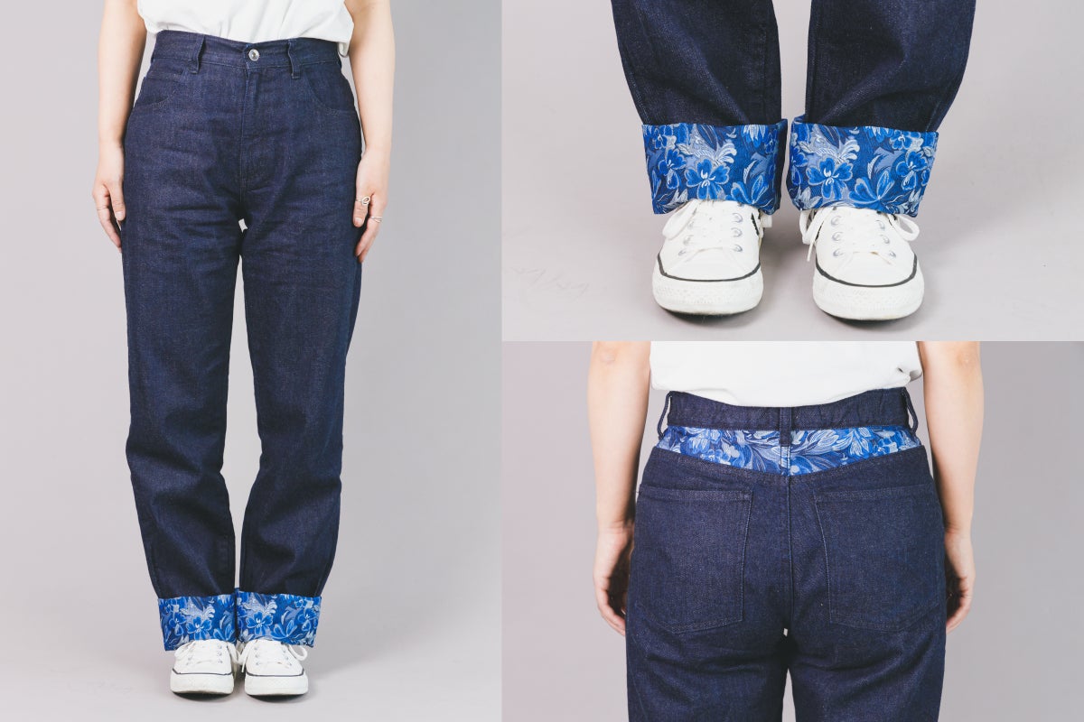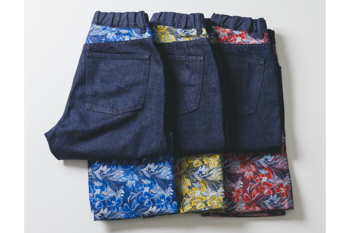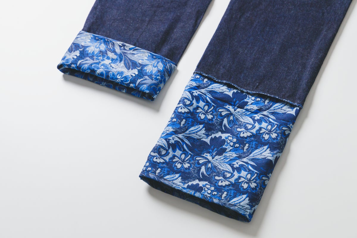ディテールにこだわった部分は、西陣織の柄生地をより際立たせるためにステッチは同系色を使用。リベットを使用しないシンプルなデニムとなってます。
