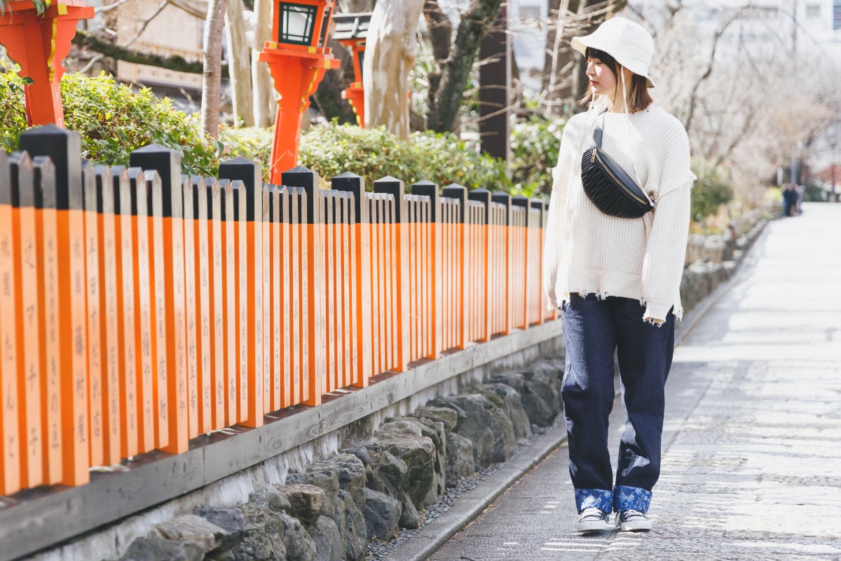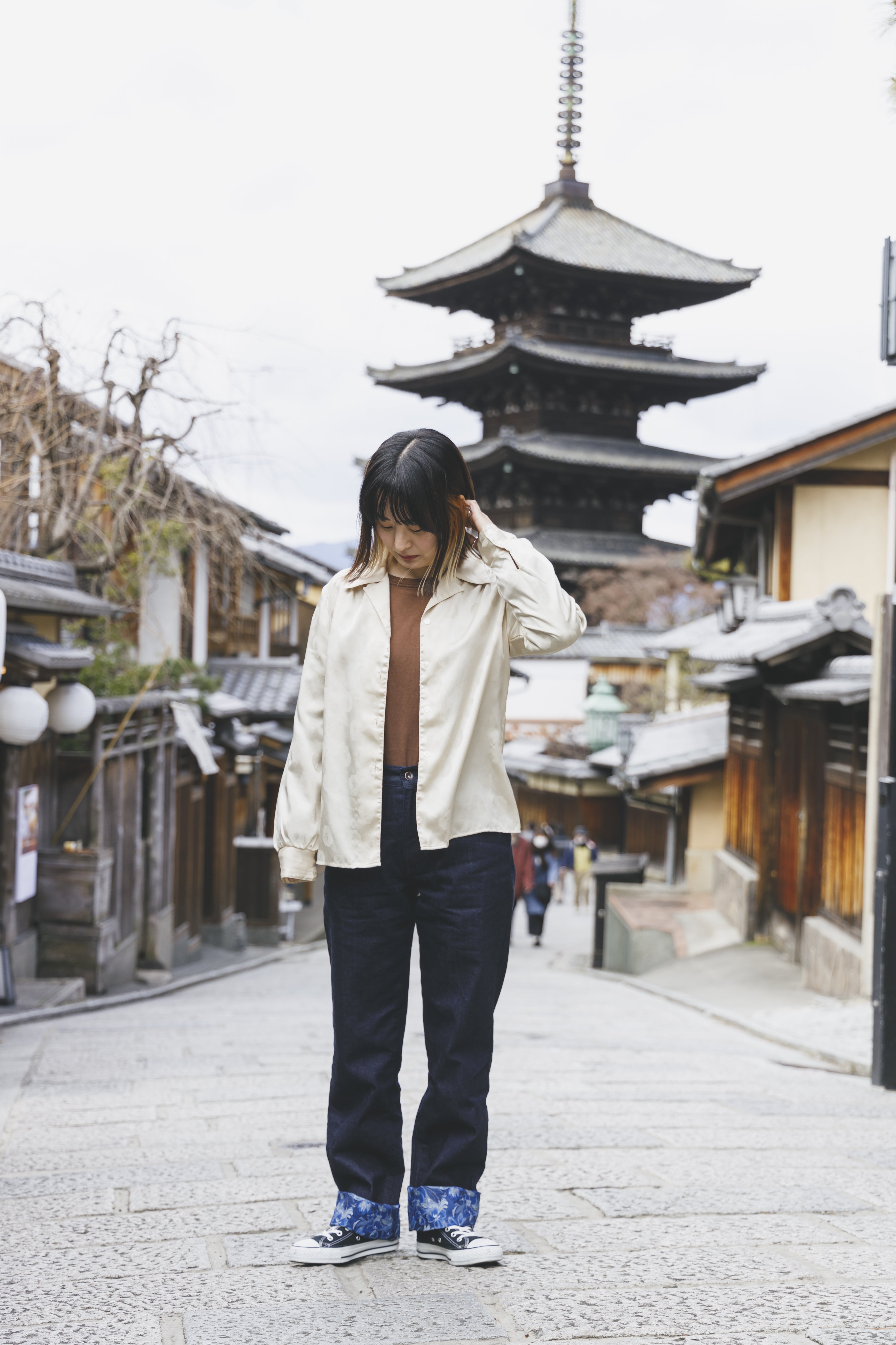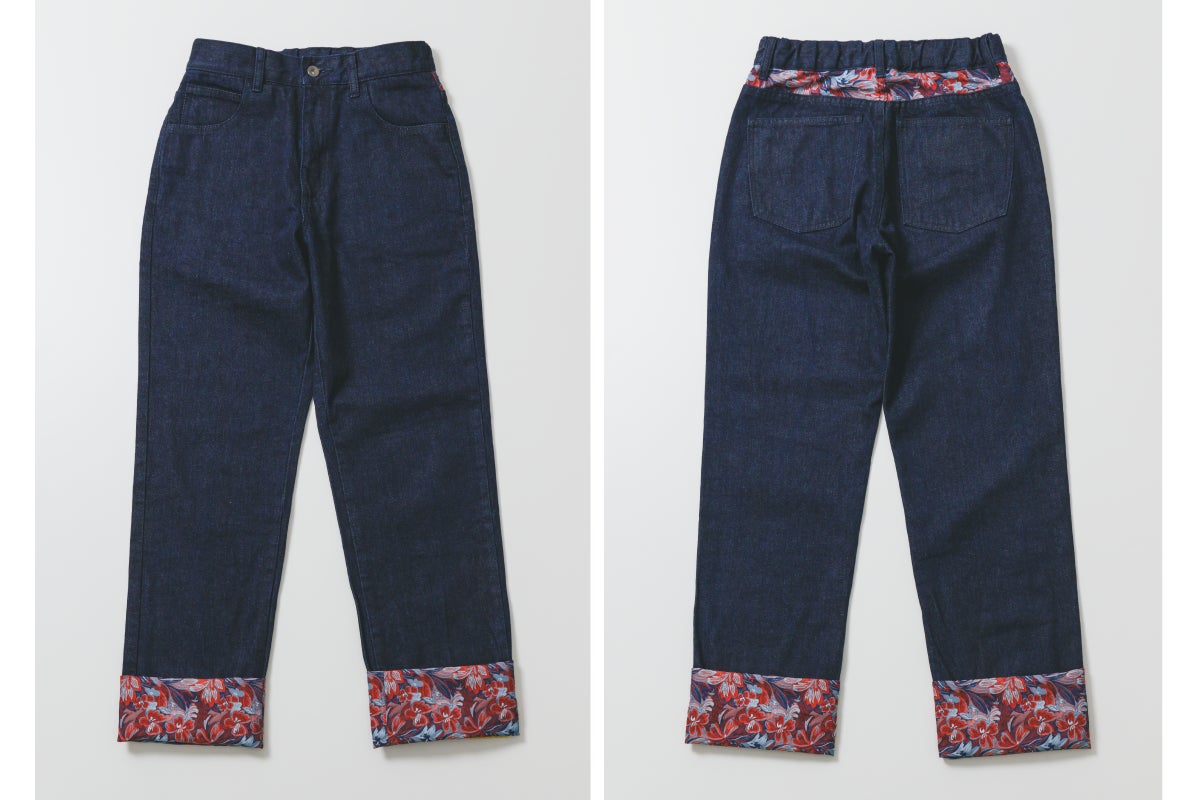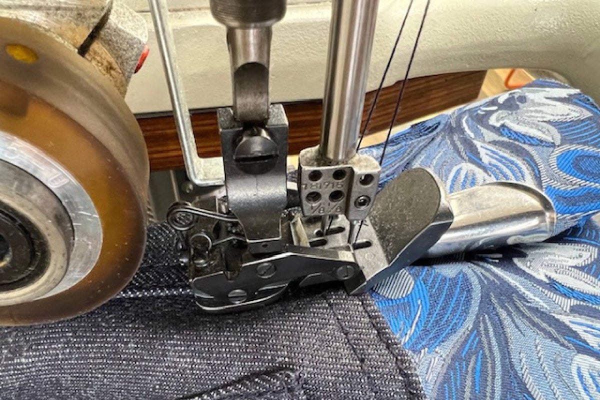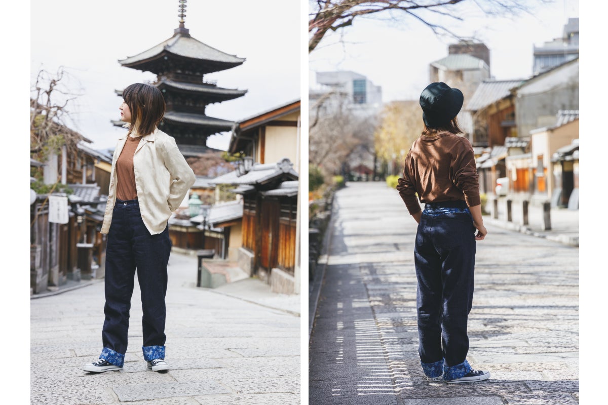 ディテールにこだわった部分は、西陣織の柄生地をより際立たせるためにステッチは同系色を使用。リベットを使用しないシンプルなデニムとなってます。