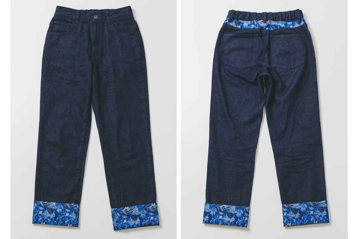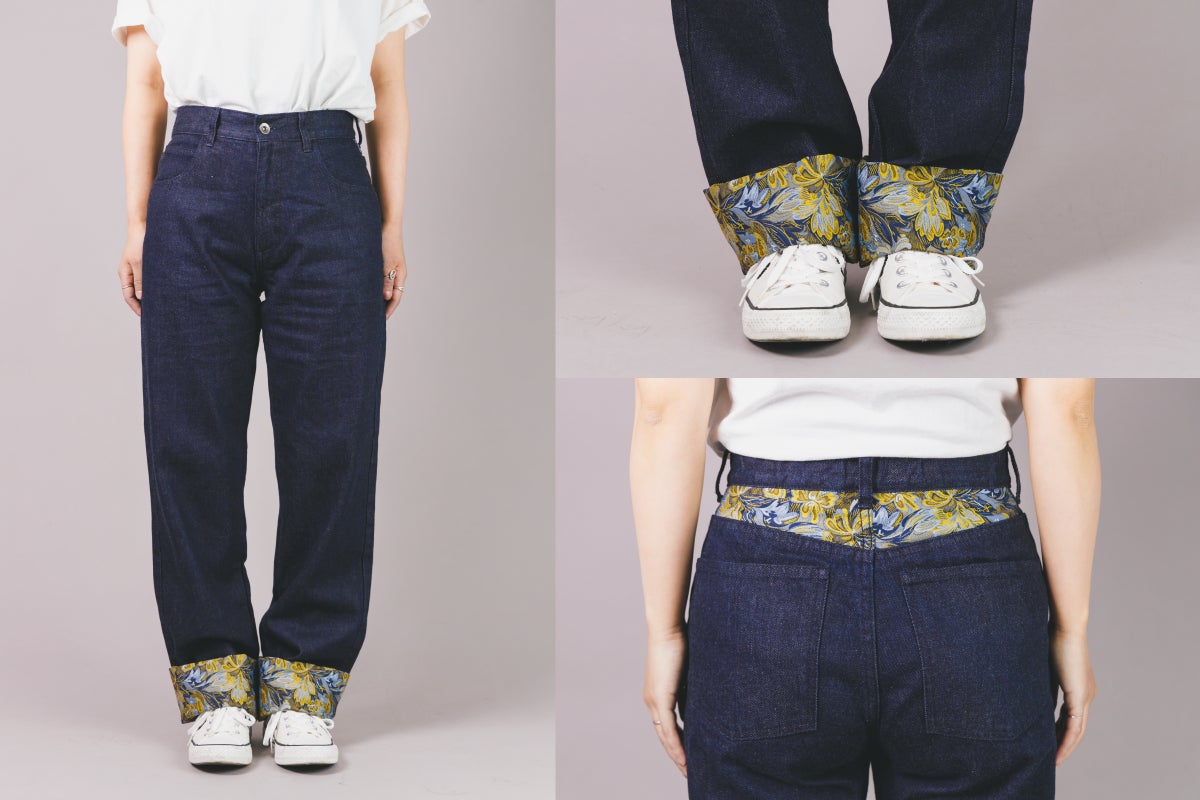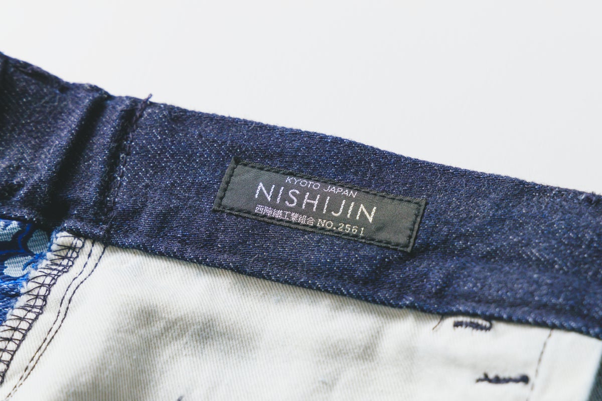 裾部分とバックヨークに京都の西陣織を施したデザインのコラボジーンズです。
