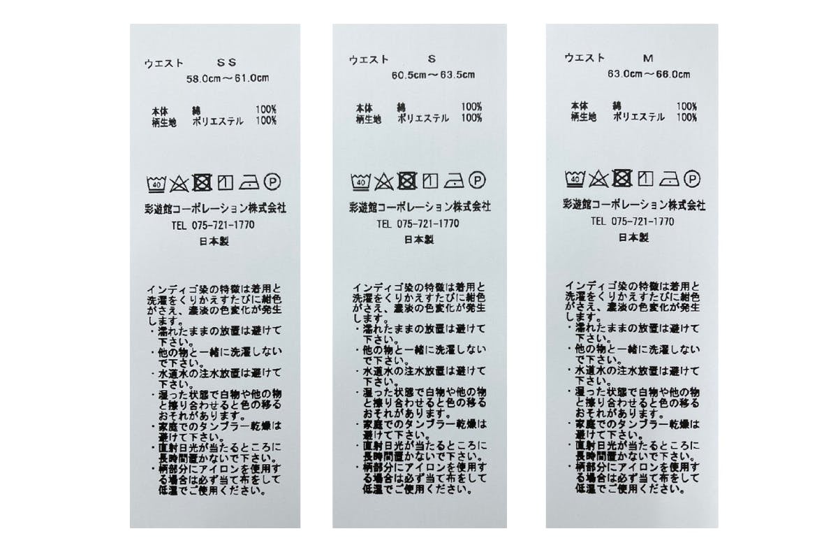 ウォッシュタグです。サイズ・素材・インディゴ染めの特性等を記載しております。