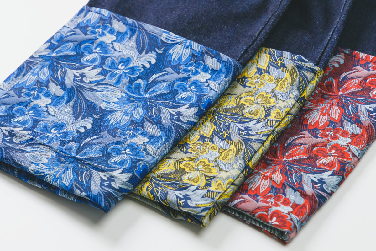 一方、岡山県倉敷市のデニムも独自の拘りでブランドとしての地位が確立され、西陣織とのコラボで日常 にあるべきものとして何か提案できないかと模索し今回の企画が生まれました。