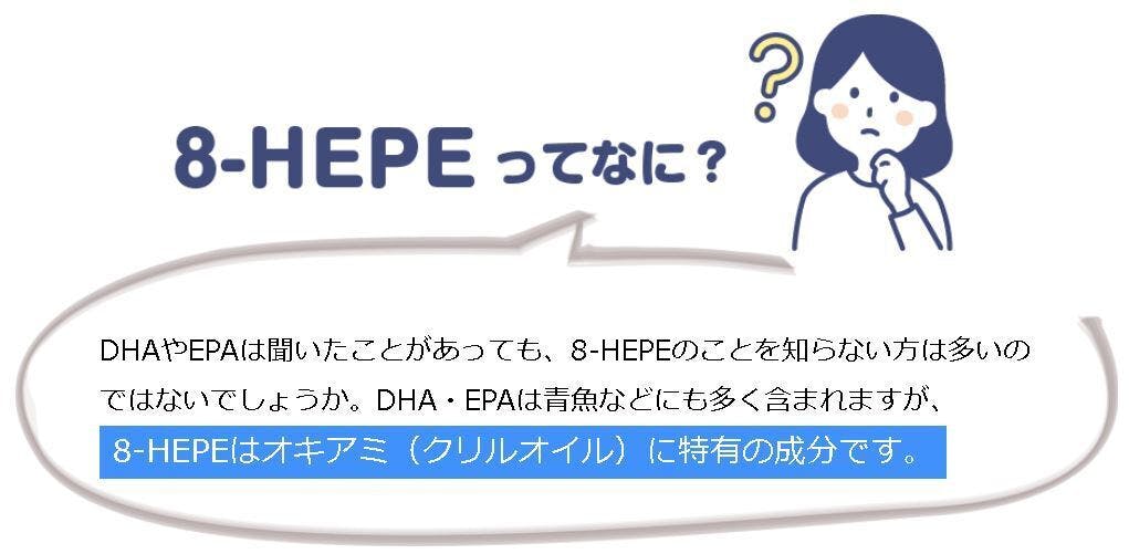 8-HEPE(8ヒープと読みます)は、私たちがイサダから発見した新規機能性成分です。魚油にも含まれるEPA・DHAと違って、8-HEPEはイサダに特徴的な機能性成分で、他のオイルから摂取するのは難しい成分です。