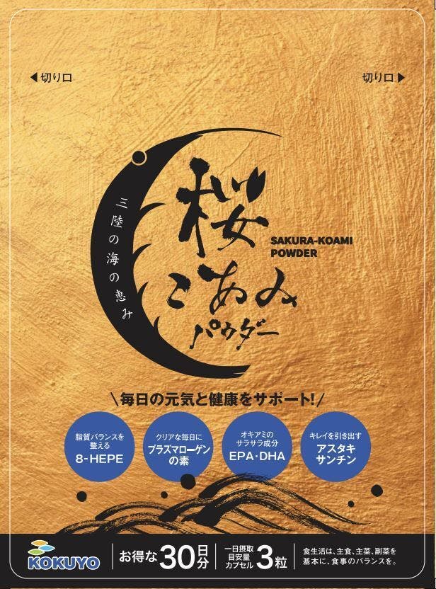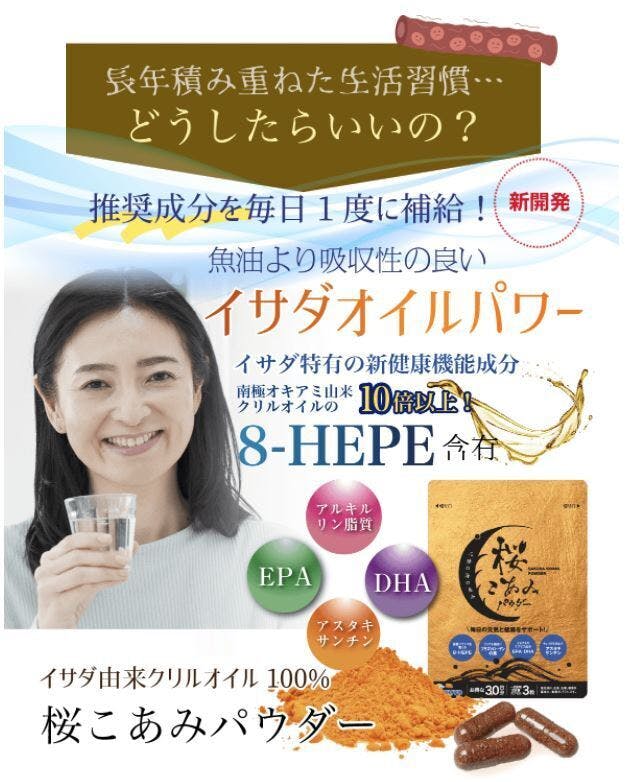 桜こあみパウダーは、イサダのみを原料とした粉末オイル素材で、EPA・DHA、アスタキサンチンに加えて、8-HEPEとアルキルリン脂質を含有する、全く新しい製品です。