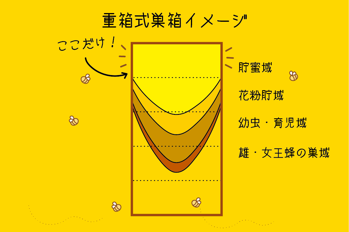 私たちは、日本ミツバチを減らすことのないよう、上層部の蜜層のみを採取しています。