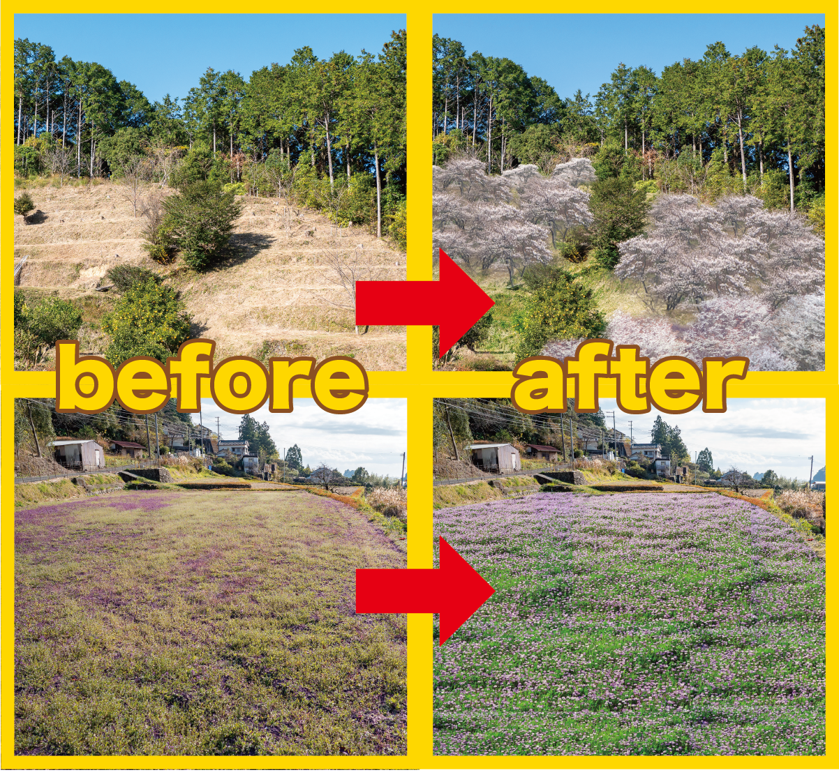 (菜の花、レンゲ、ひまわり、マリーゴールド、コスモス、山桜苗など)