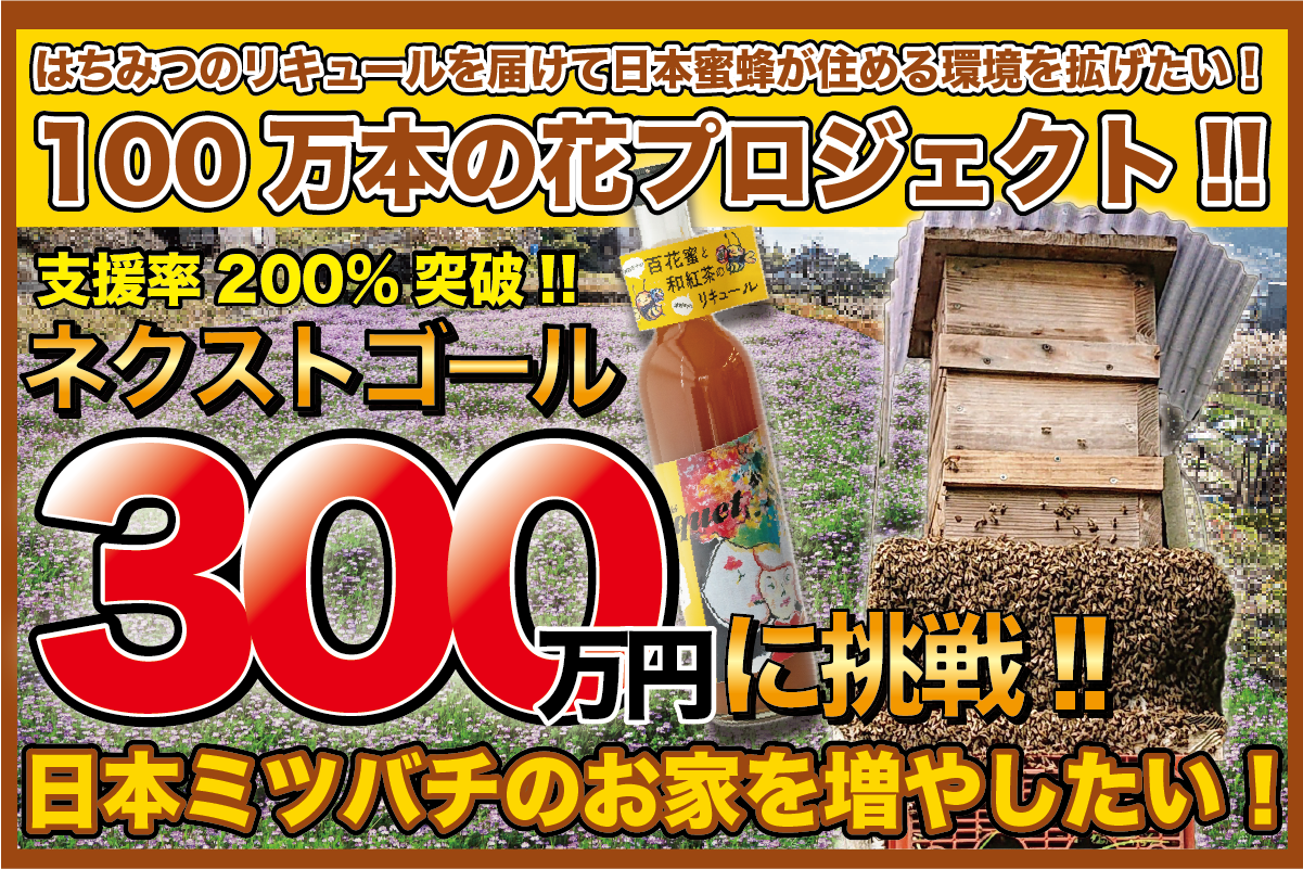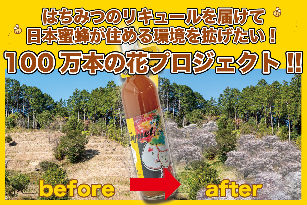 みなさんは日本ミツバチが激減しているのをご存じですか?日本ミツバチが住むためには、豊かな草花が必要です。私たちは今も日本ミツバチが住める環境を広げるため、レンゲやマリーゴールドなどの種を蒔いていますが、日本ミツバチが住める環境を取り戻すには圧倒的に資金が足りません!そこで、日本ミツバチの蜂蜜で作ったリキュールを皆様にお届けし、その支援金で100万本の花を植えたいと思います!