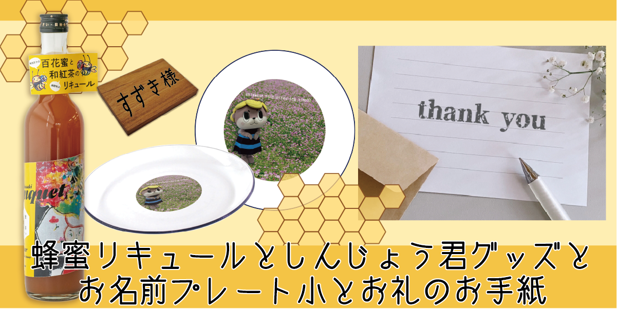 ・10,000円コース① 蜂蜜リキュール1本+お名前プレート(小)+しんじょう君グッズ+お礼のお手紙