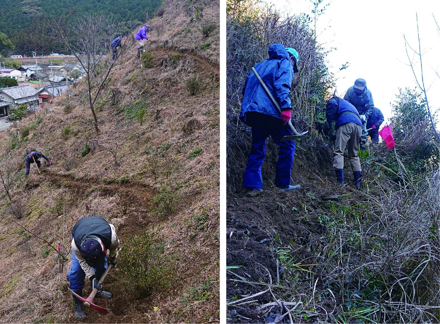 今年になってからは、避難場所にも指定された地元の山に遊歩道を設置するため、地域の仲間30名と数日に渡り汗を流しました。