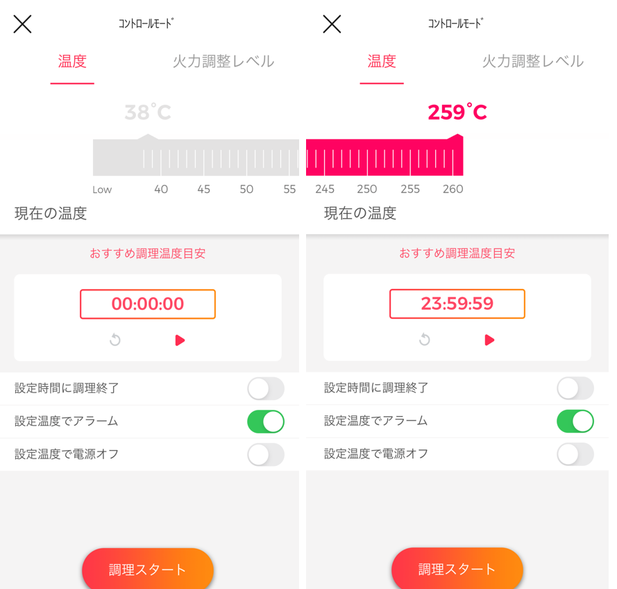 「Hestan Cue」には、アプリ内のレシピと連動して調理を行うほかに、『コントロールモード』も搭載しております。『コントロールモード』では調理中の温度38℃~259℃まで設定することができ、タイマー機能(23:59:59まで設定可能)と合わせて調理することができます。ほったらかし料理や低温調理も可能なので、アイデア次第で作れる料理の幅が広がります。