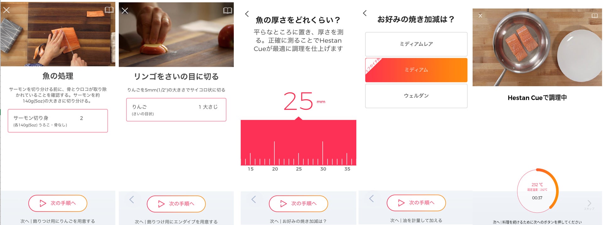 肉や魚を焼くレシピには、個体の重量のみならず、サイズを計測しアプリに入力することもできます。厚みを入力し、お好みの焼き加減を選択すると「Hestan Cue」が焼き上げてくれます。