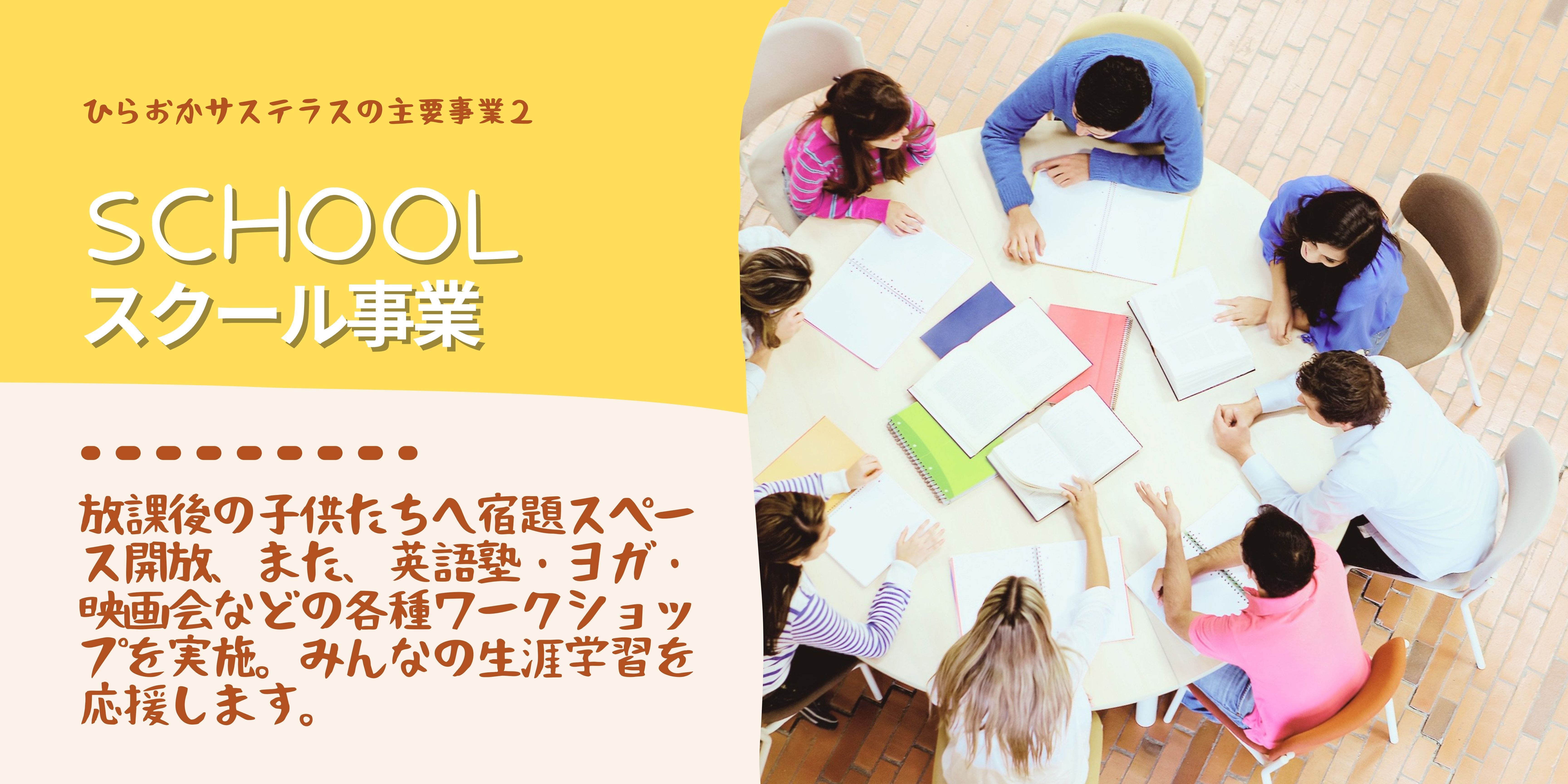 2つ目は、誰もが参加できるワークショップや教室、映画上映会などで社会教育を実践するスクール事業