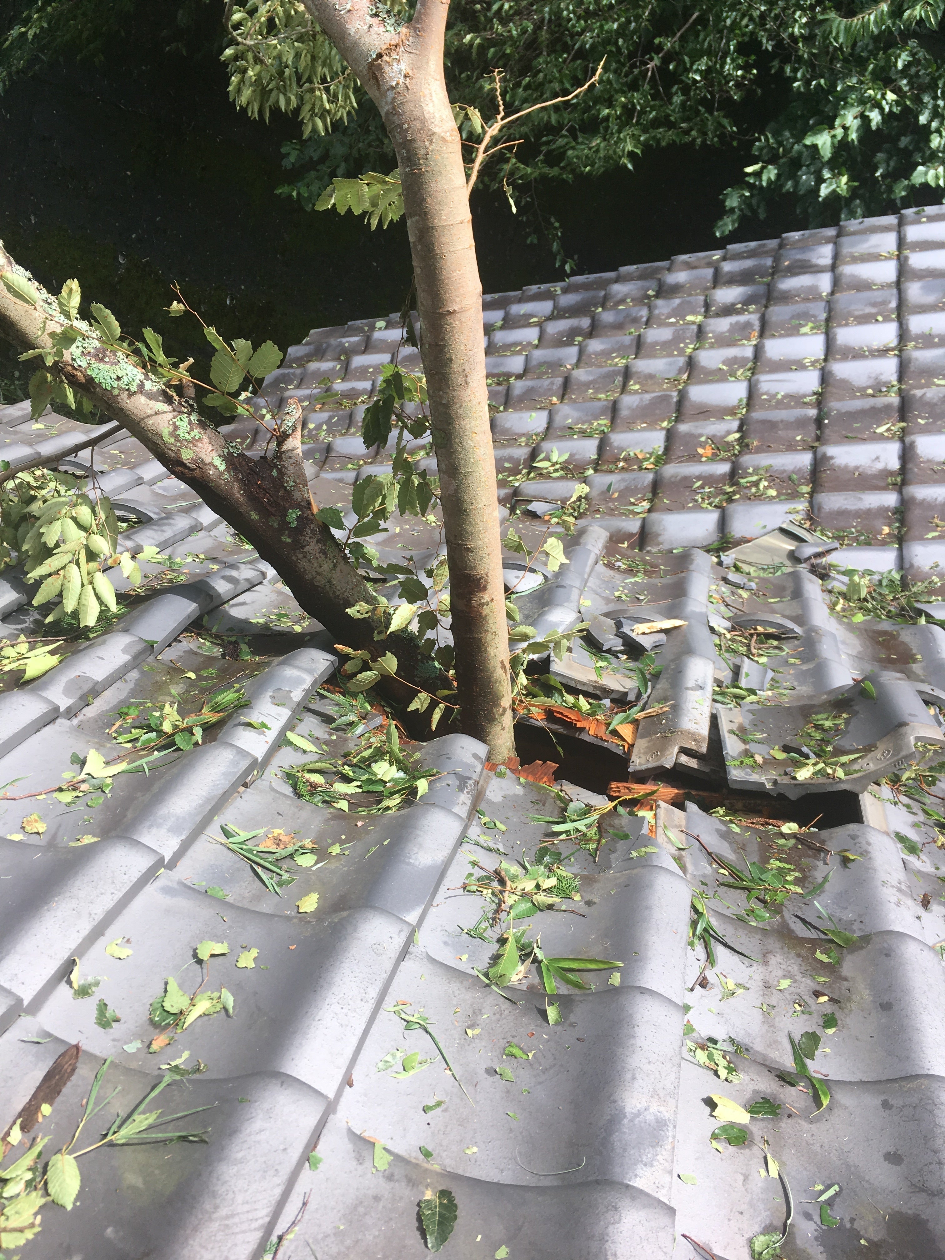 【強風で折れた大きな枝約10mが屋根に刺さり、なんと深夜の座敷へ貫通!】