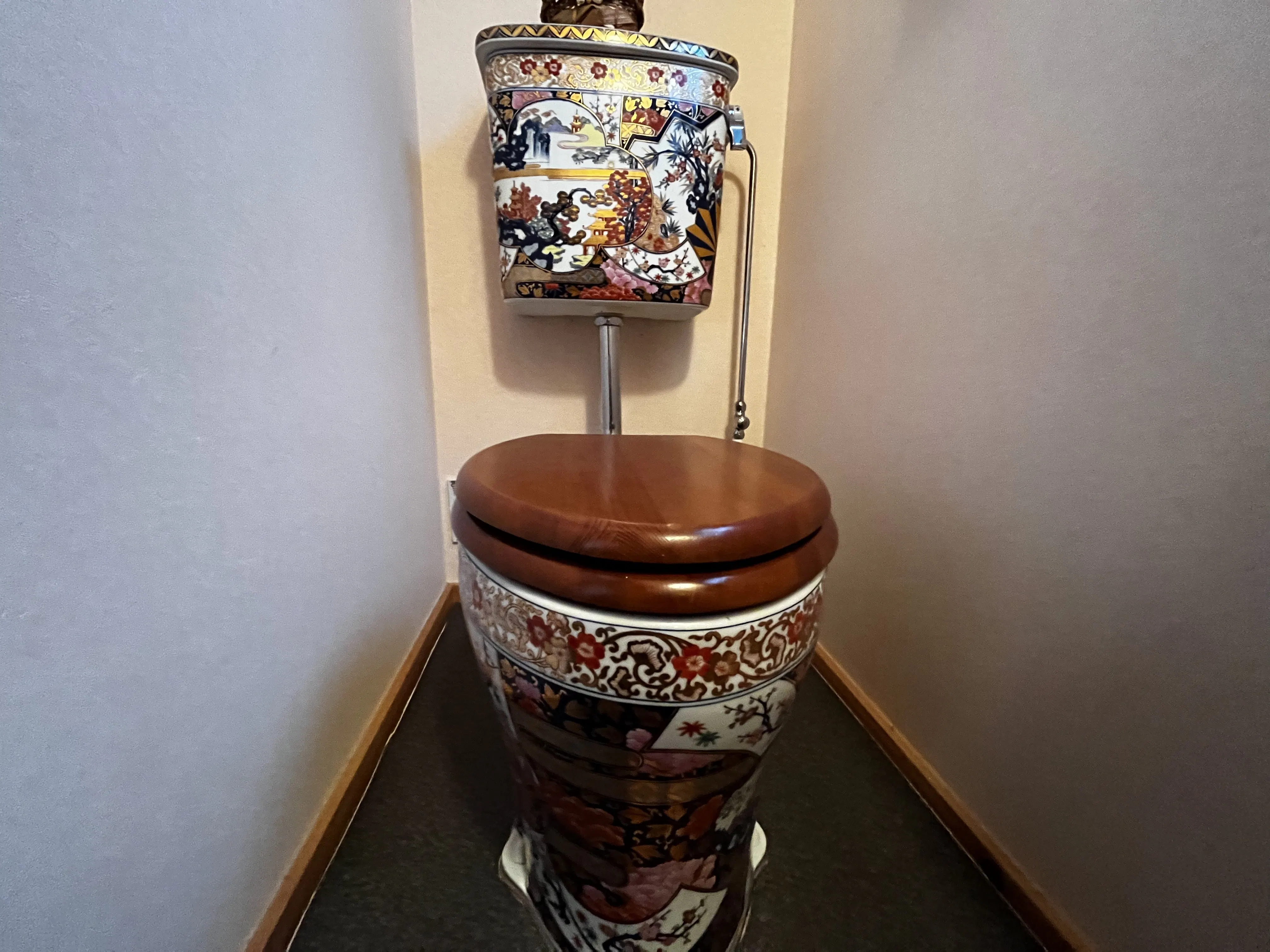 もう亡くなったご主人(僕からすると叔父にあたる)は骨董商という仕事に生涯を捧げていました。そのご主人は有田焼が大好きだったそうです。そして何十年も前に完全オーダーメイドで有田焼のトイレを完成させ現在に至ります。