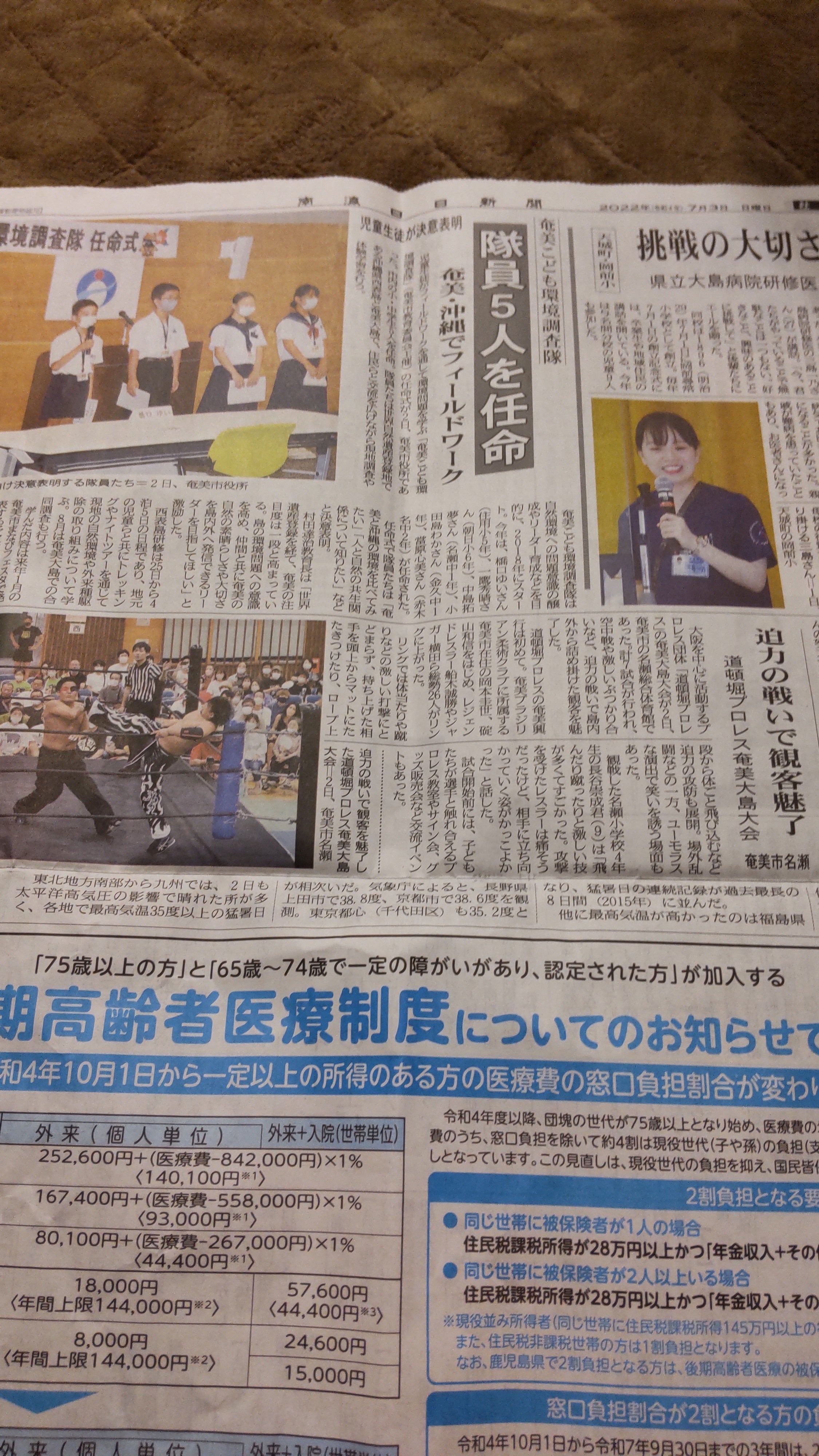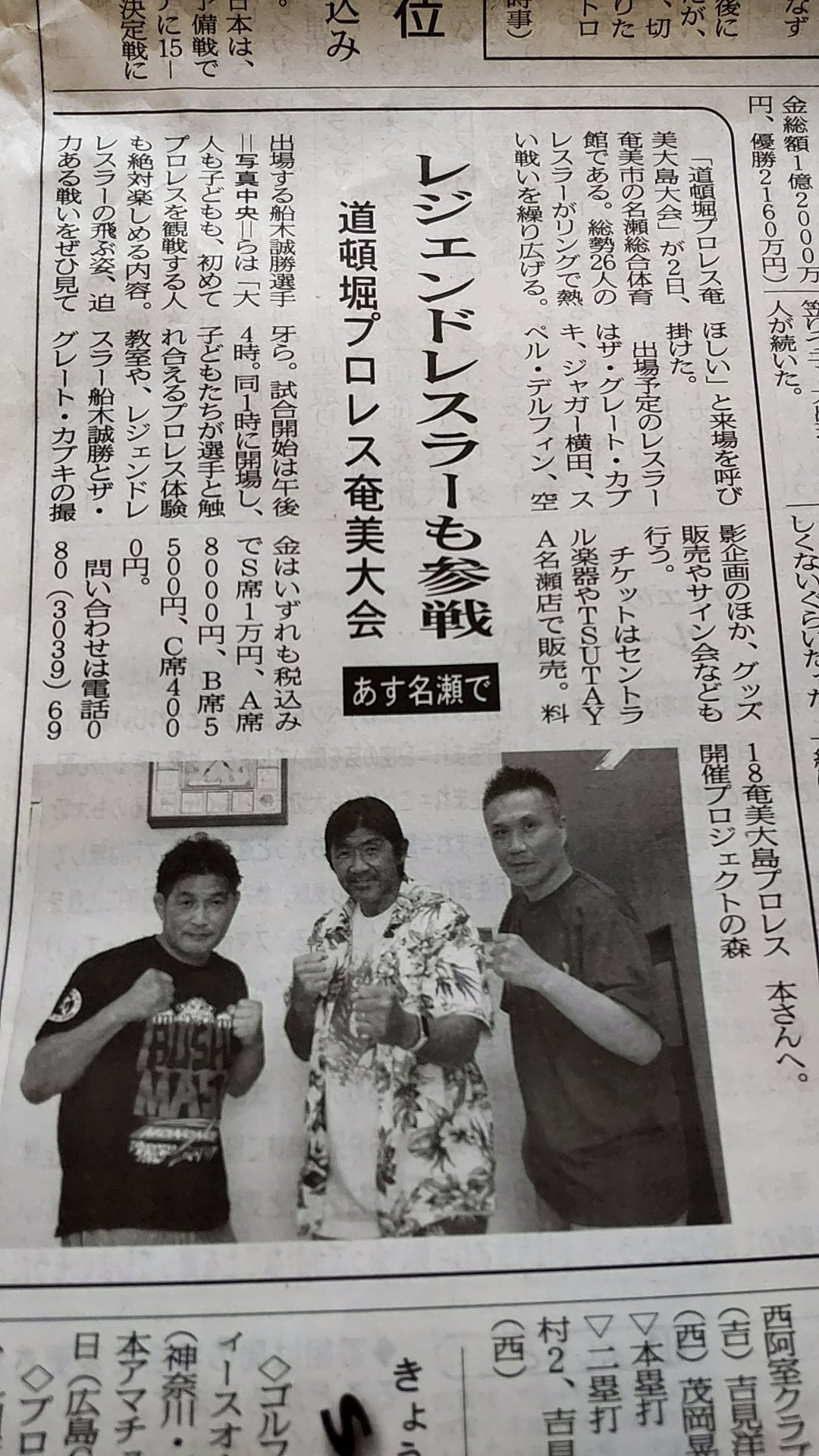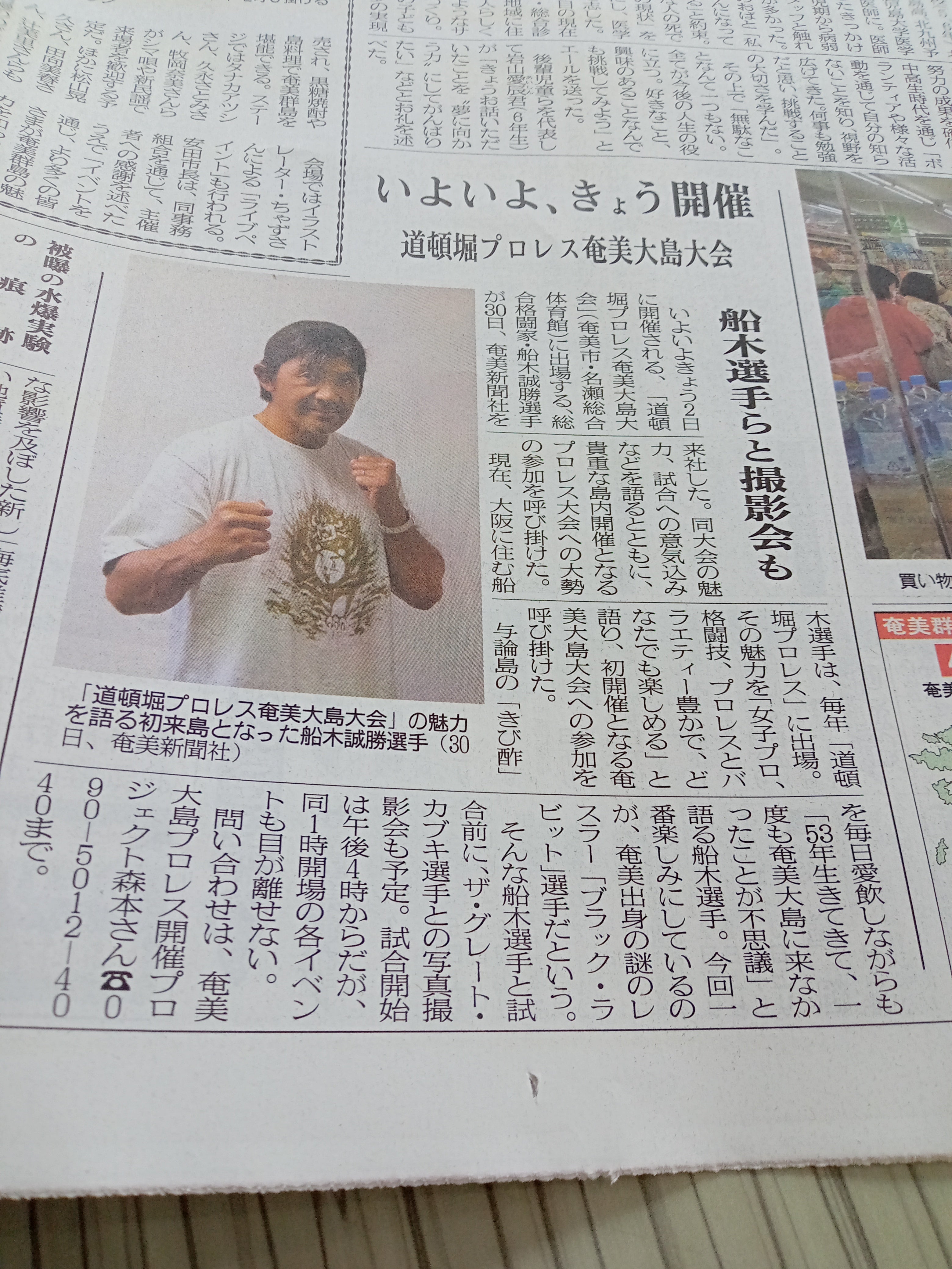 7月1日金曜日南海日日新聞と7月2日奄美新聞に、船木誠勝選手の写真と、飛んだり跳ねたりするプロレスとご当地キャラクターブラックラビット選手(アマミノクロウサギがモデル)に期待を!とのコメントを、掲載いただきました。