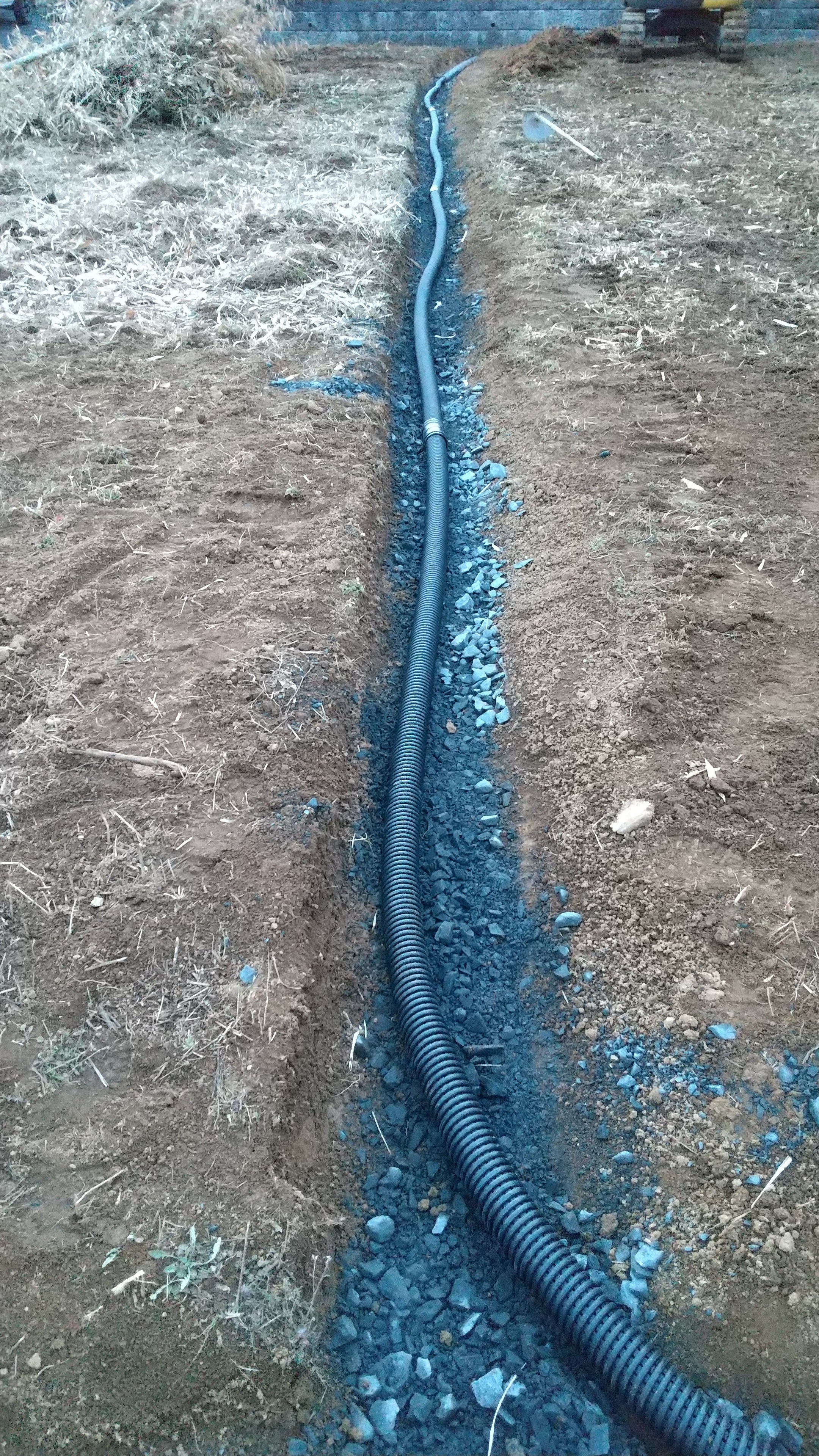 ハウスの回りに溝を切って、排水パイプを埋めました!