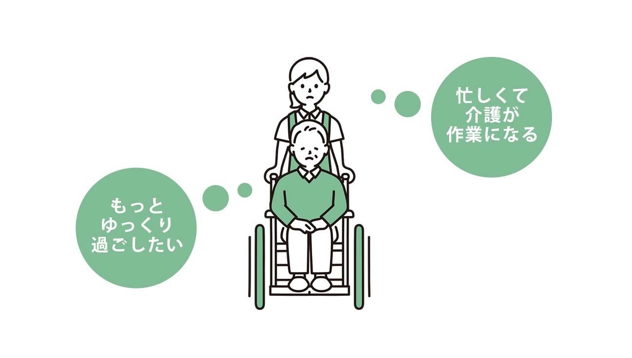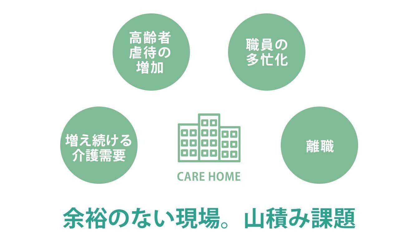 人がいない中、「事故を起こさないように」と必死に目の前の高齢者を介護している職員が大半です。「腰が痛い」といった身体的な辛さや「休憩や公休がとれない」「私はこんな介護がしたかったのだろうか」と悩みや困りごと、将来への不安を抱えている介護職員は決して少なくありません。