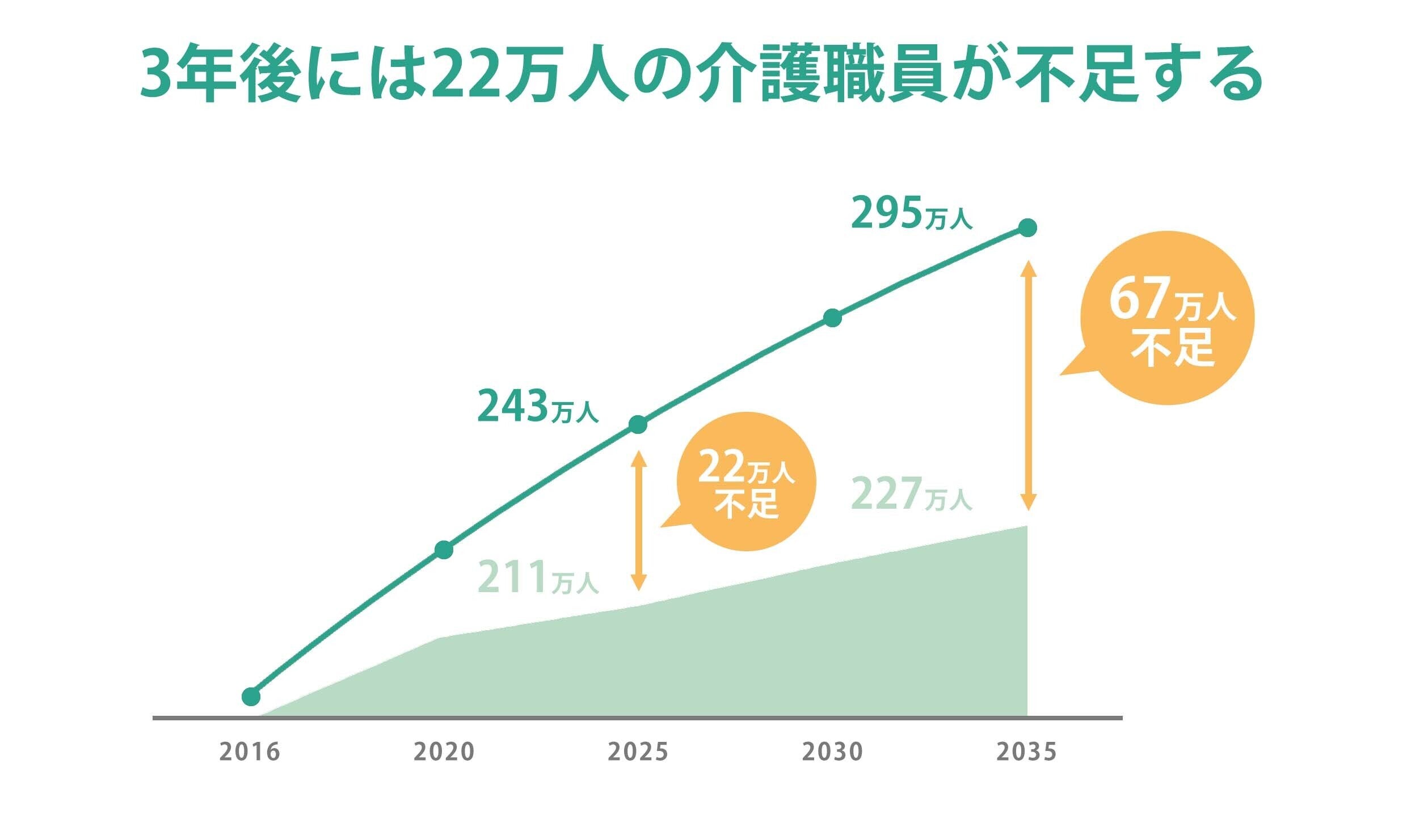 高齢者が急激な勢いで増加する2025年に向けて、圧倒的に不足する介護人材を確保しなければなりません。厚生労働省の調査では2025年までに約22万人、2035年までに67万人の介護人材が不足するとされています。