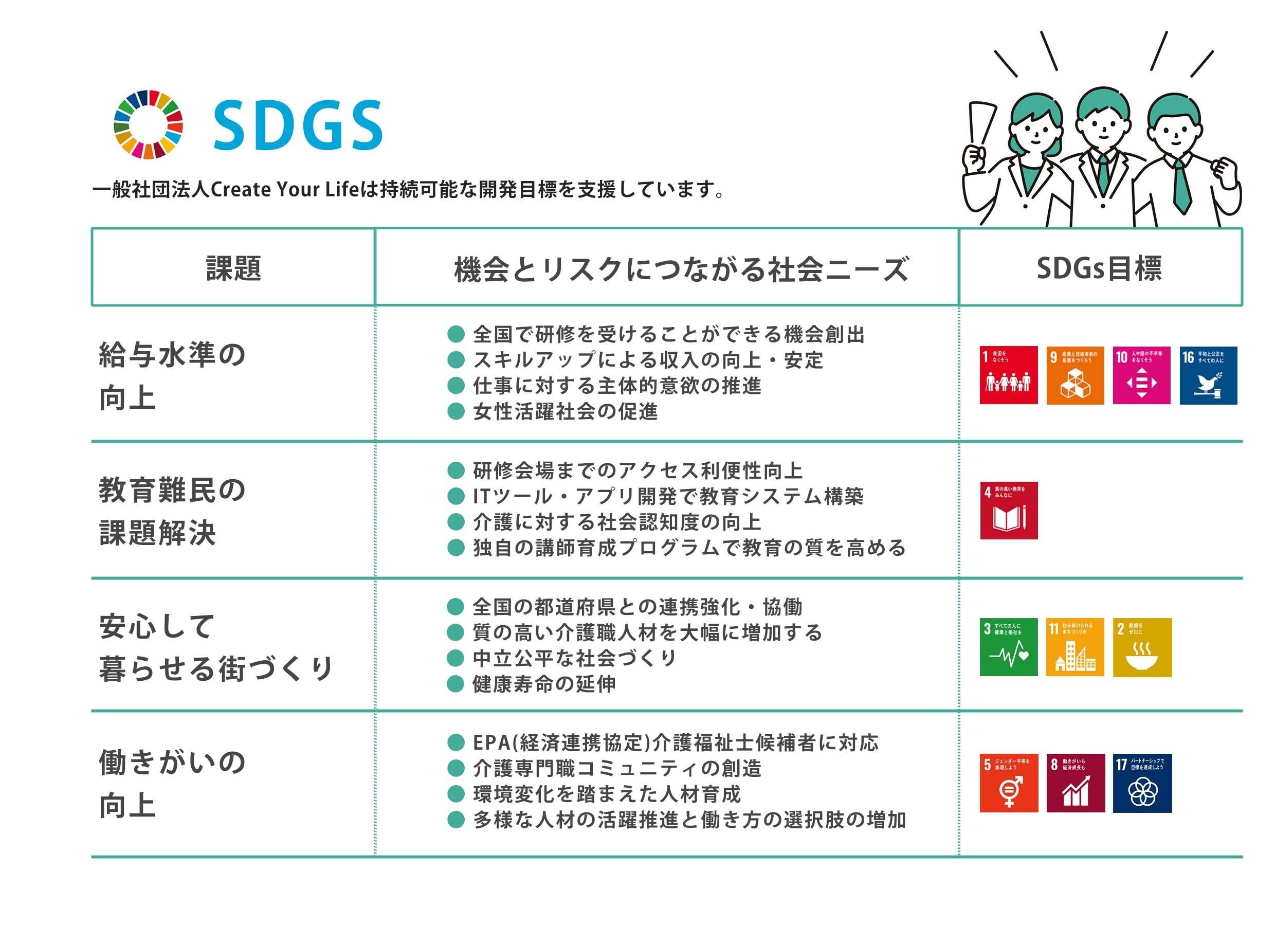 SDGsとは、持続可能な開発目標と呼ばれ、貧困や教育難民、人種差別、平和など地球規模の問題を解決するために「誰ひとり取り残さない」という理念のもとに考えられた目標です。私たちの組織は「介護職の社会的地位を高め、高齢者福祉全体を教育から支えること」をミッションに社会課題の解決に導きます。